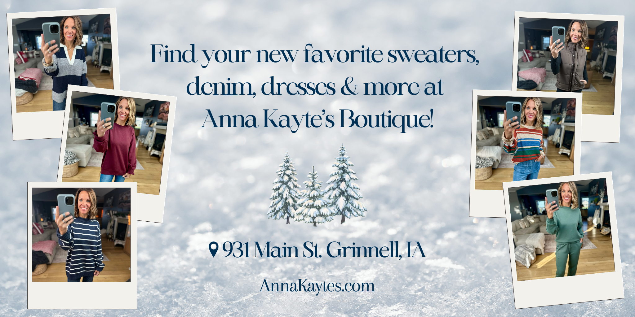Welcome to Anna Kayte's Boutique, located in Grinnell, Iowa! Shop the latest trends in fashion and accessories. Discover stylish and inclusive options perfect for every body type. Visit us today to elevate your wardrobe with our curated selection of trendy pieces!