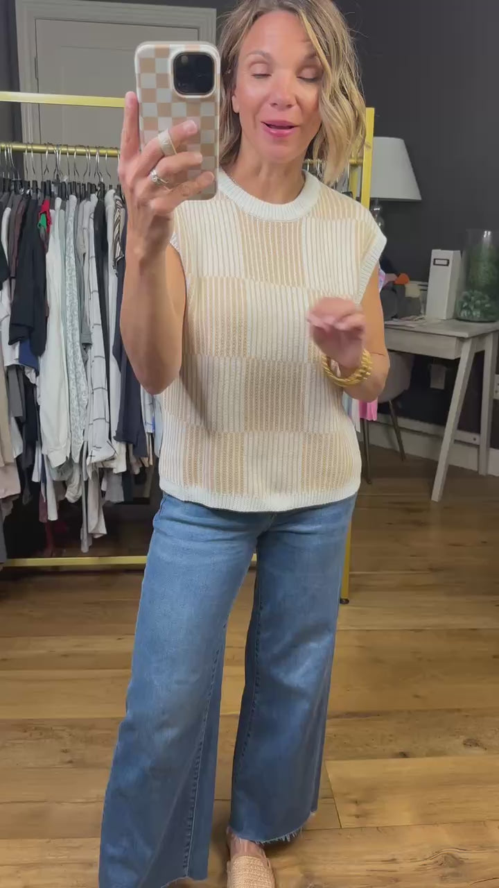 Checkered print is going to continue being on trend into this year too! This knit top comes in two checkered color options. It fits true to size with a standard length and sleeveless style. Pair with denim and slides!