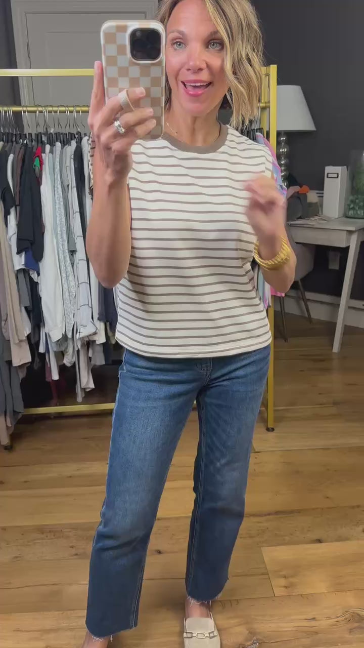 This is a striped tank in a neutral soft brown color! This tank fits true to size with a crew neck and standard length. This is a great option on its own or layered under a jacket or cardigan!