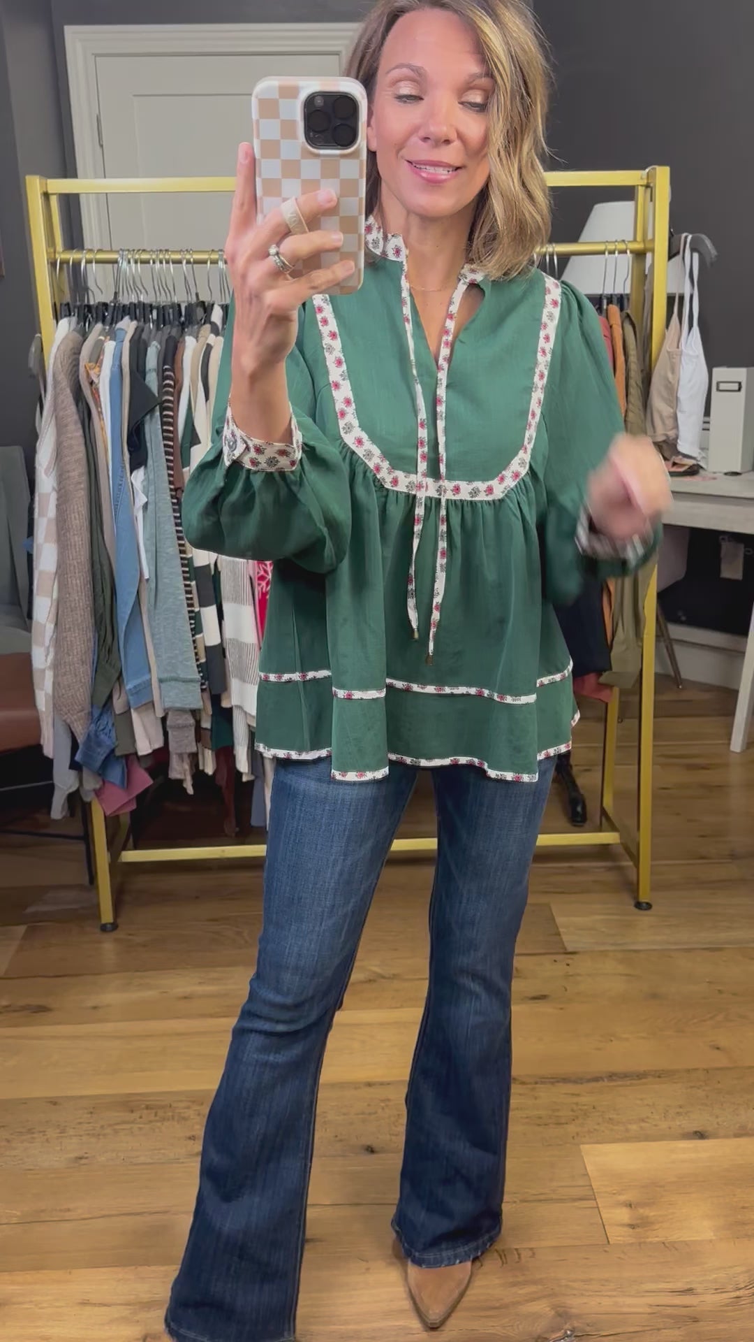 We grabbed this top in two great fall colors! This is a flowy blouse with floral trim detailing and a true to size fit. This has a modest v-neck and an optional tie at the neckline. Pair with denim and booties or mules!
