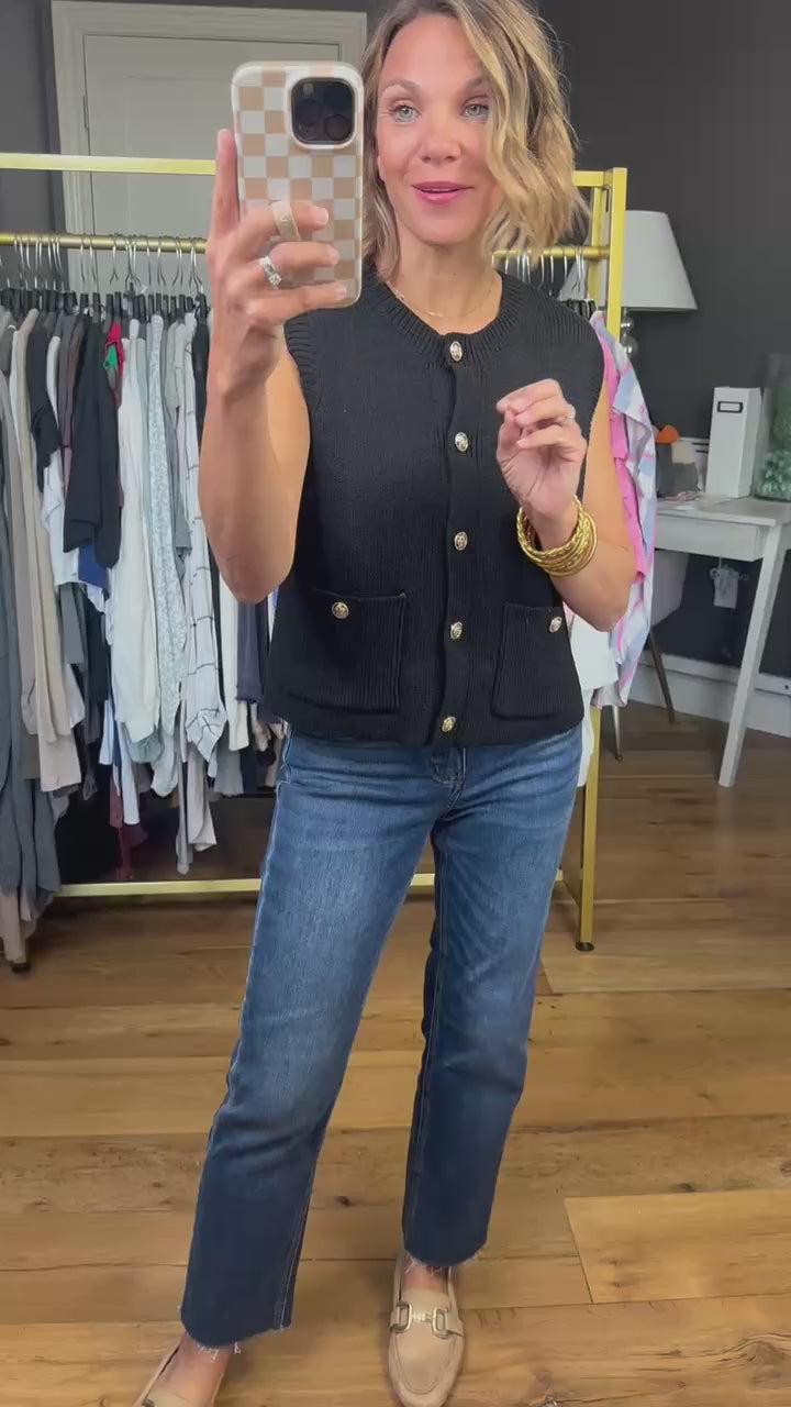 This is a super chic option for dressing up for work, or wearing more casually! This is a button up, crew neck, sleeveless vest that fits true to size. It has button detailing and pockets as well. You can pair this over a long sleeve tee or on its own!
