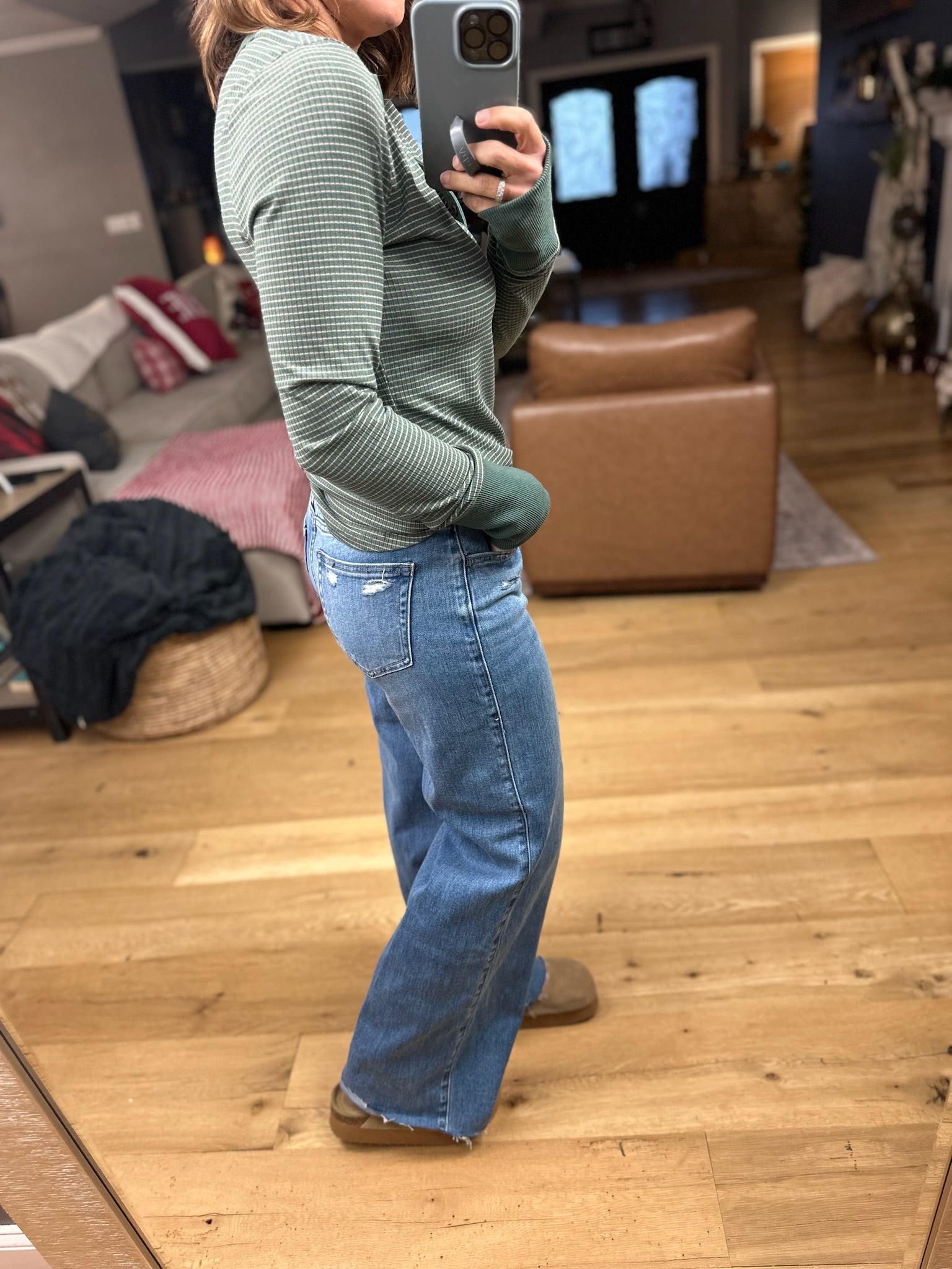 You can never go wrong with a henley style top! This one has a striped print, lightly fitted style and shirttail hem. This top fits true to size and is an easy option to pair with denim and a vest for the fall!