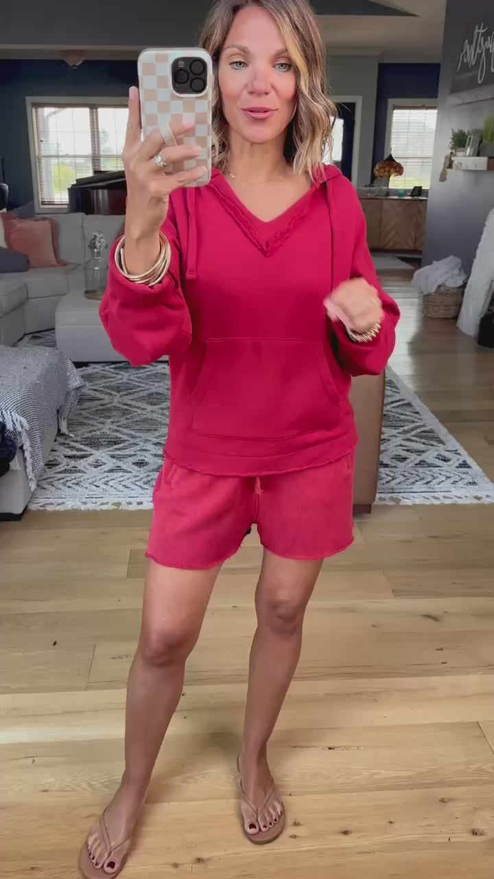 Brighten your wardrobe with the Ruby Skies Hoodie + Short Set! This true-to-size knit set in a striking ruby red includes a cozy hoodie featuring a v-neck, hood, and drawstrings. Perfectly matched with comfy shorts, it’s your go-to for relaxed days with a splash of fun and flair.