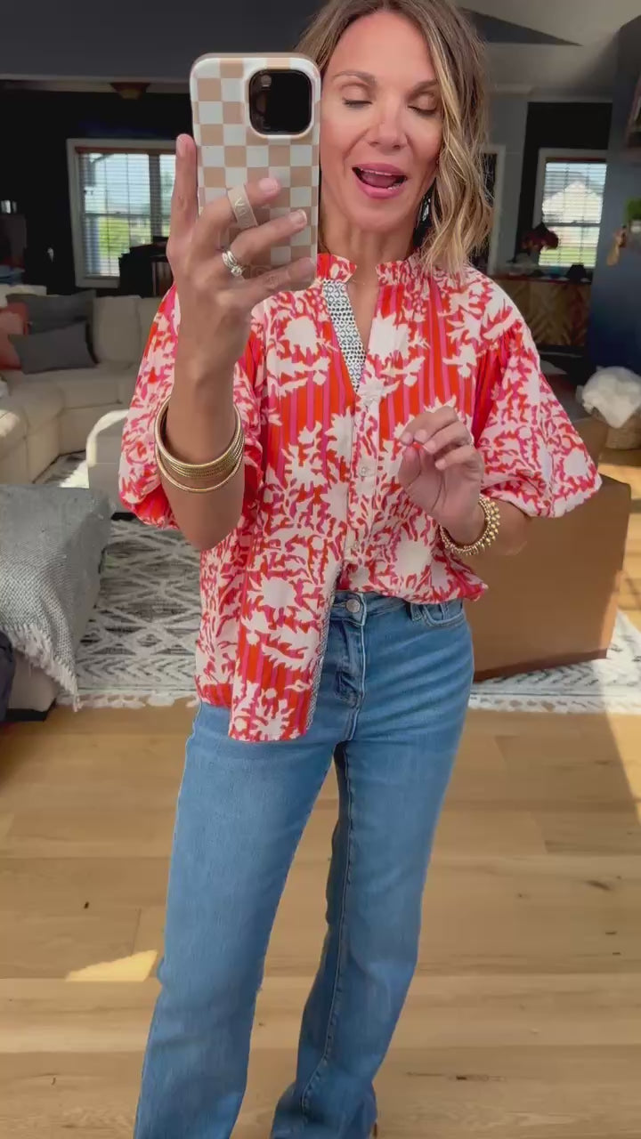 Add a splash of fun to your wardrobe with this playful red printed button-down top. Featuring charming puff half-length sleeves and a flattering true-to-size fit, it’s perfect for sunny days or casual outings.