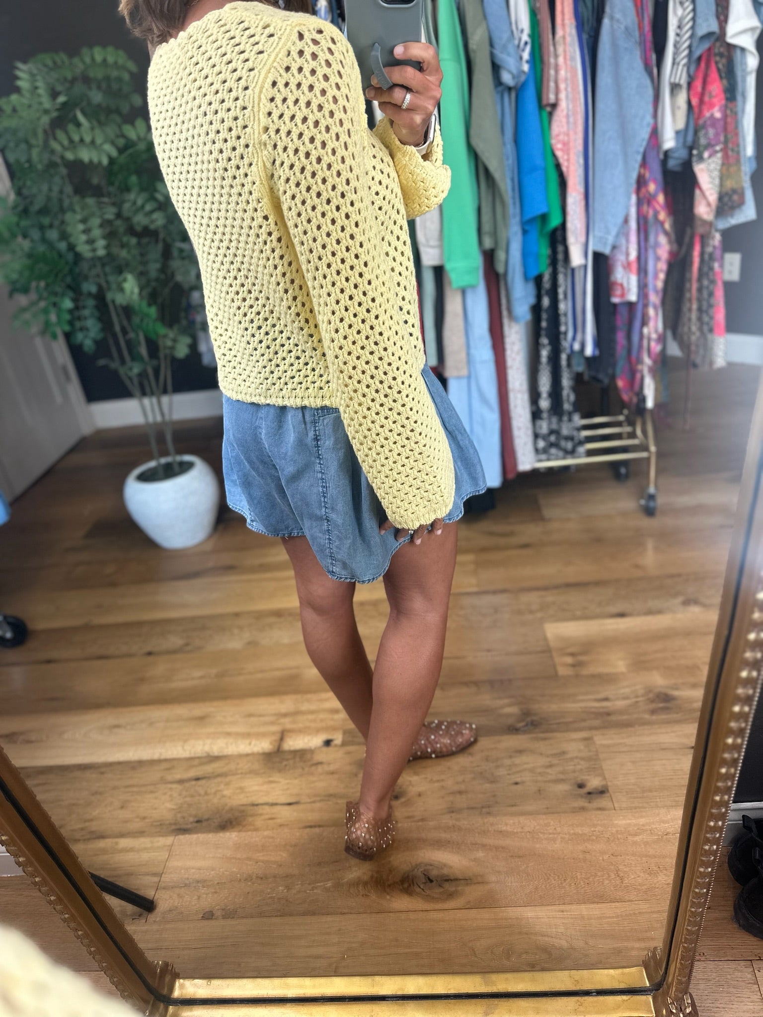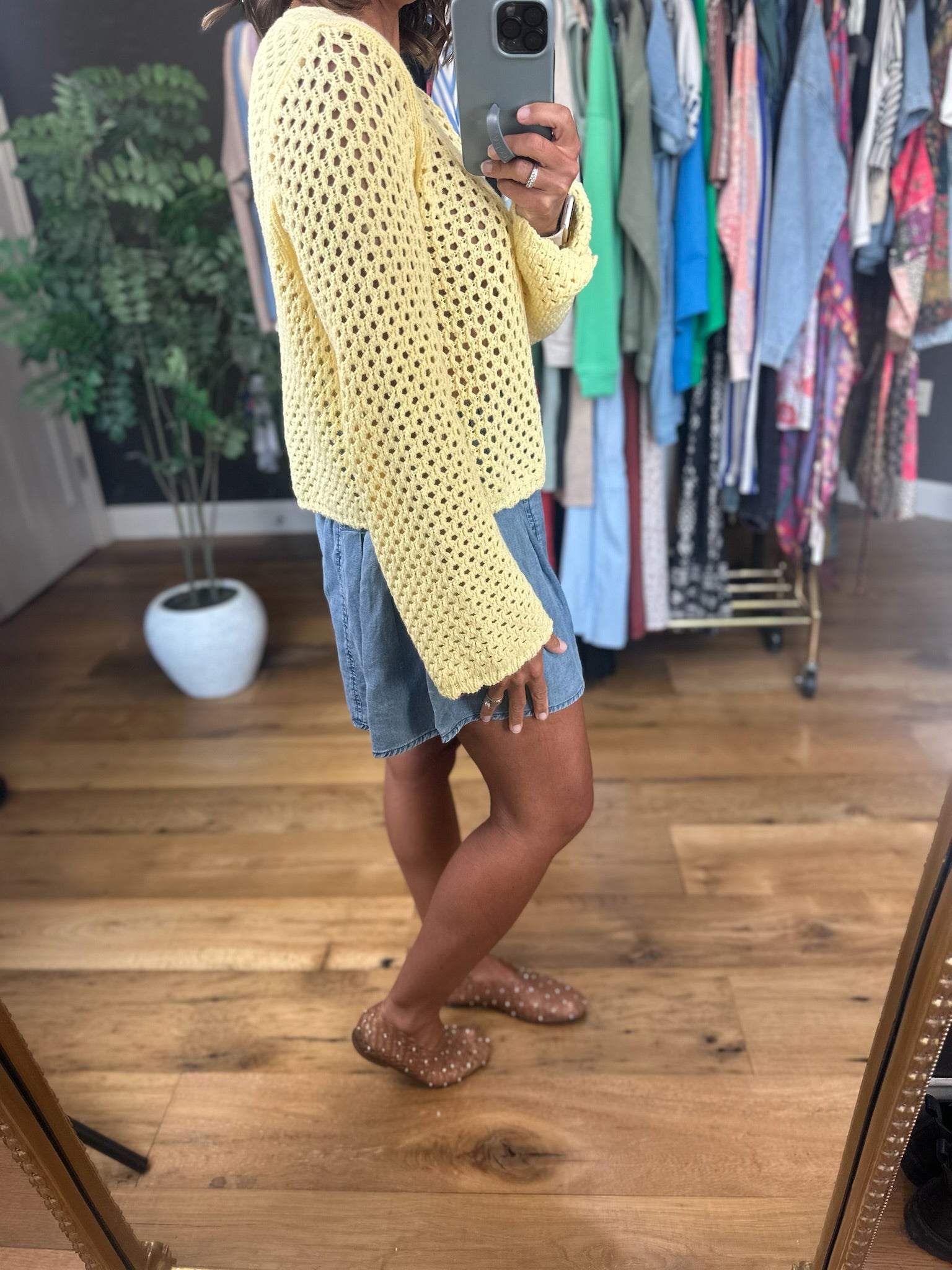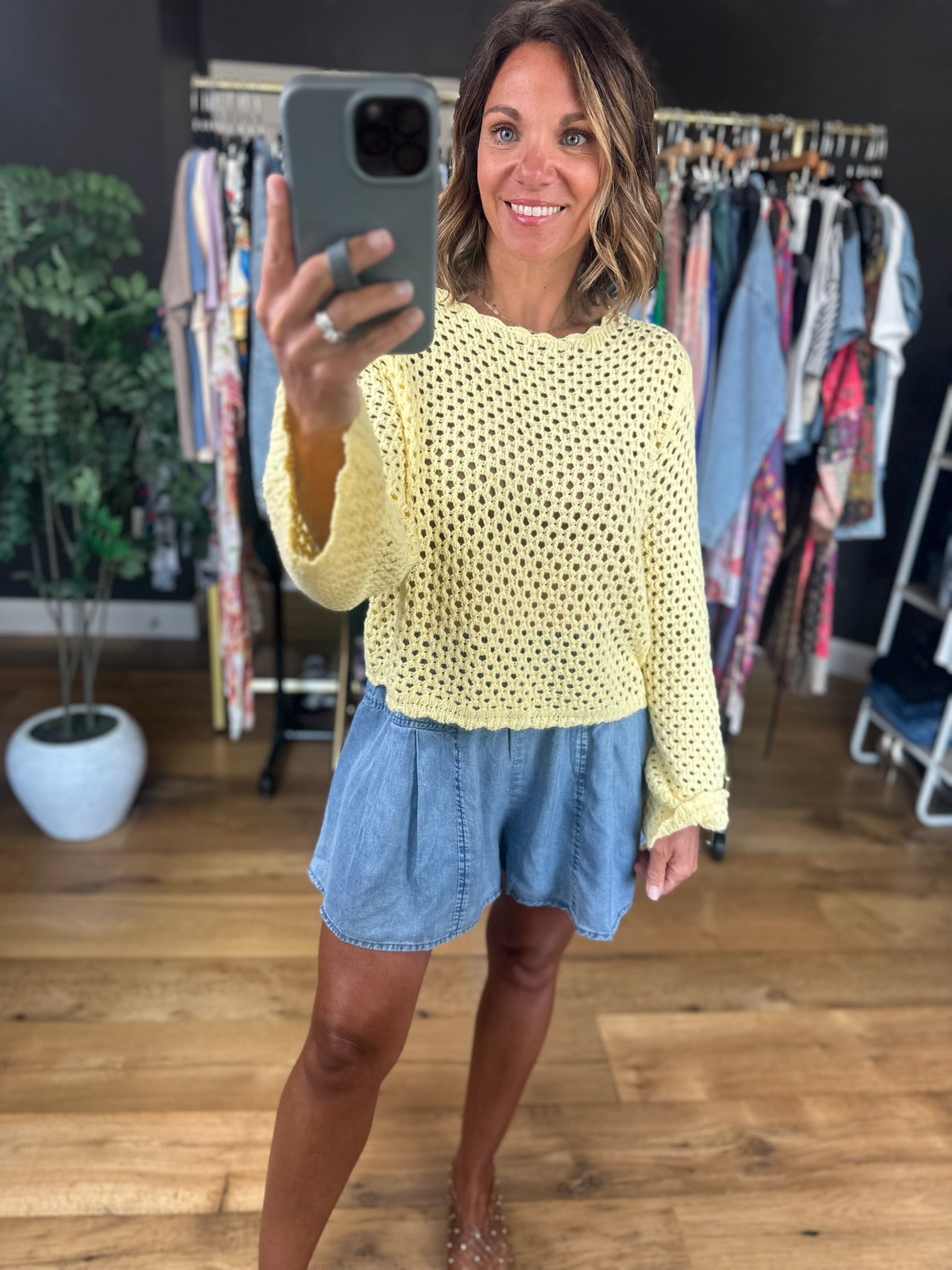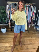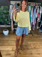 We have said it before but we will say it again, butter yellow is the color of the season! This darling crochet top is such a fun style for the spring and summer season! This fits true to size with wider sleeves and a scalloped hem. This does have an open crochet design so you can pair it over a tank, brami or nude bra.