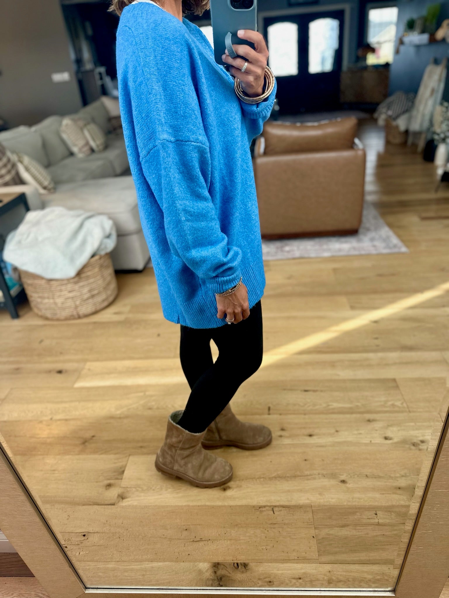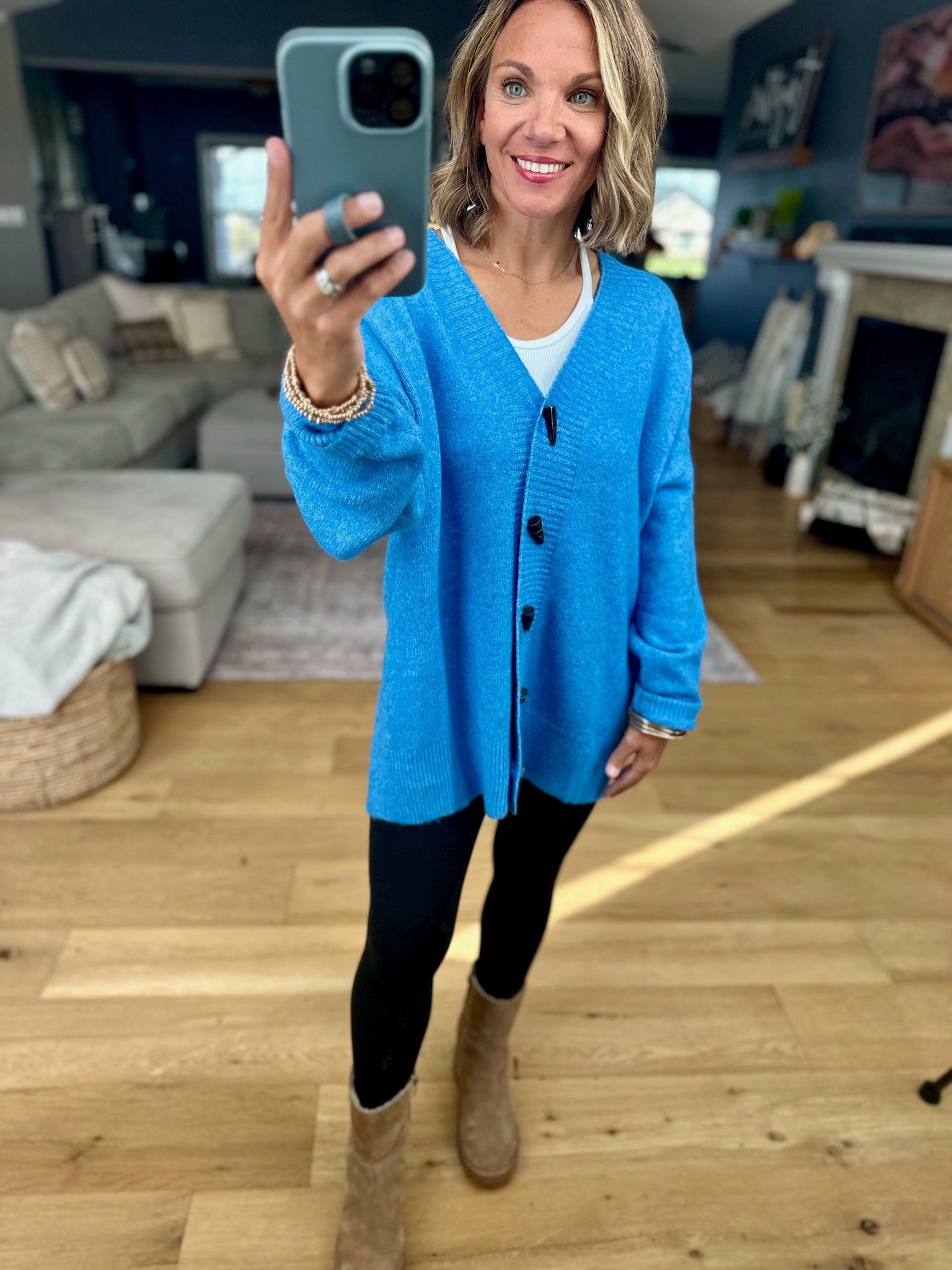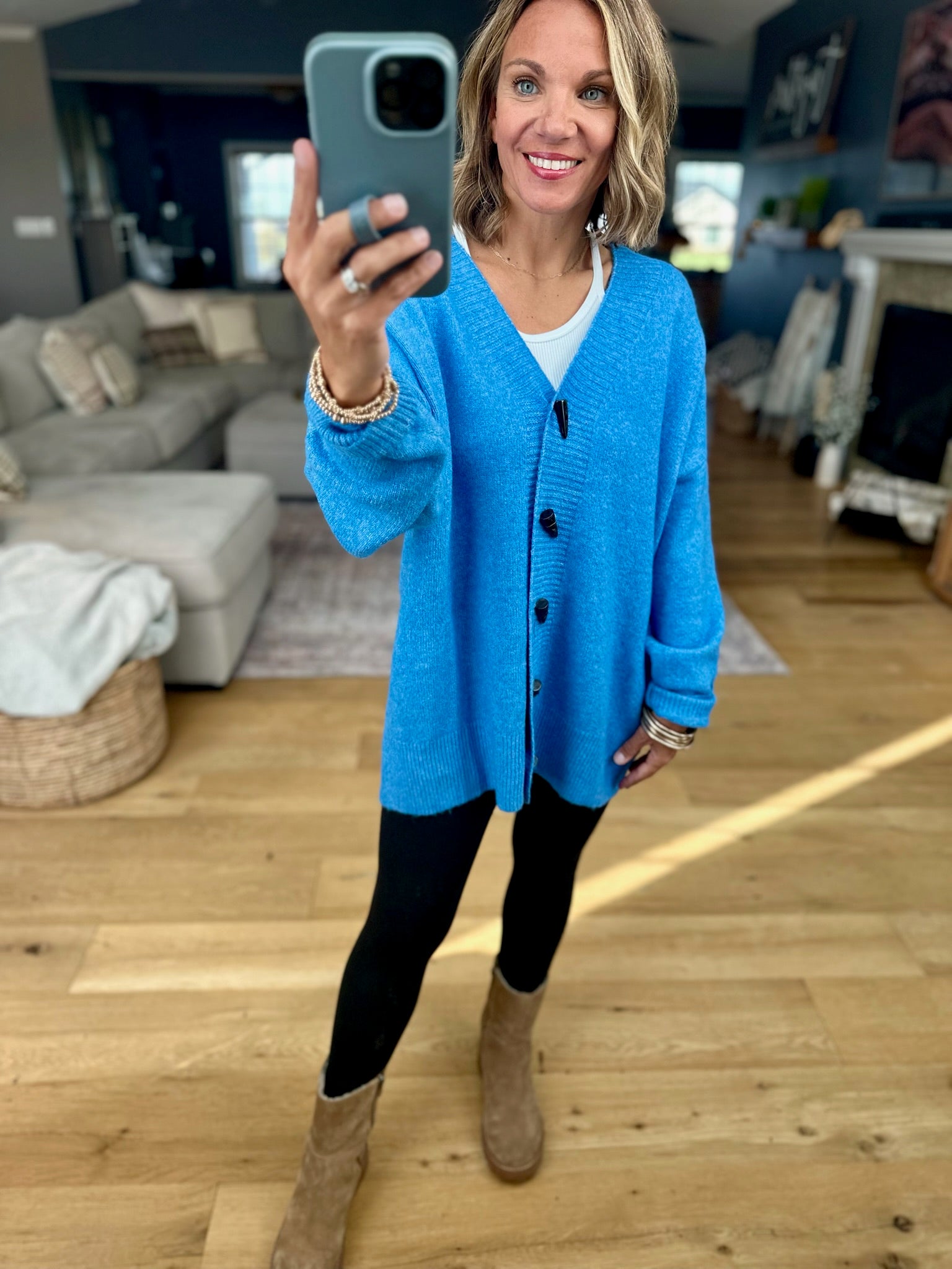 Add this pretty pop of blue to your life to brighten up your wardrobe! This fits true to size, though relaxed by design. It has buttons down the front and is a longer length. Perfect to pair with denim or leggings!