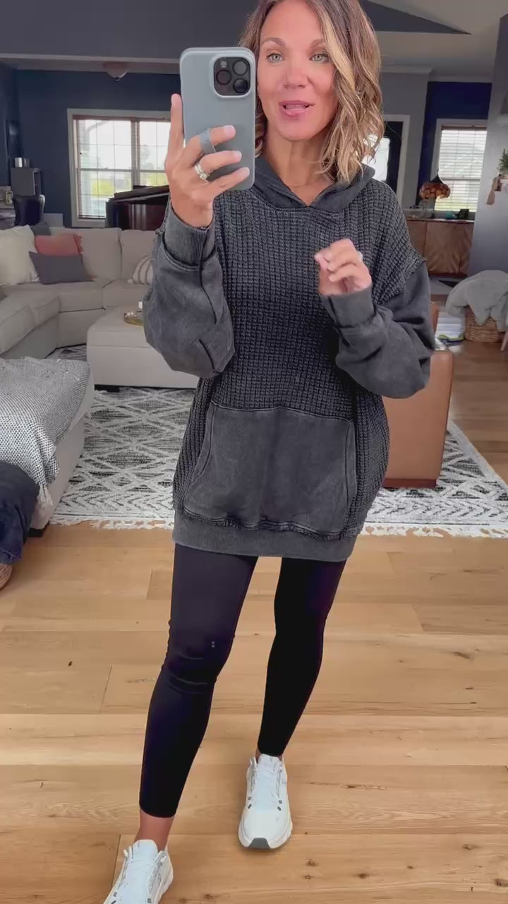 Grab this cozy hoodie for your new fall favorite pullover! This is a textured material, fits true to size and has a kangaroo pocket. We love the length on this, making it great to pair with leggings or biker shorts!