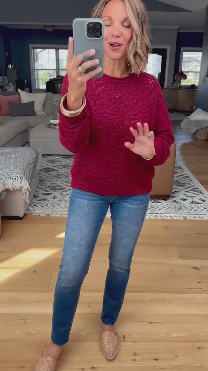 A fresh take on a classic. This crewneck top features a beautifully crafted crochet knit body that adds texture and detail, balanced with a timeless neckline and comfortable fit. Perfect for layering or styling solo, it’s a chic piece that works year-round.