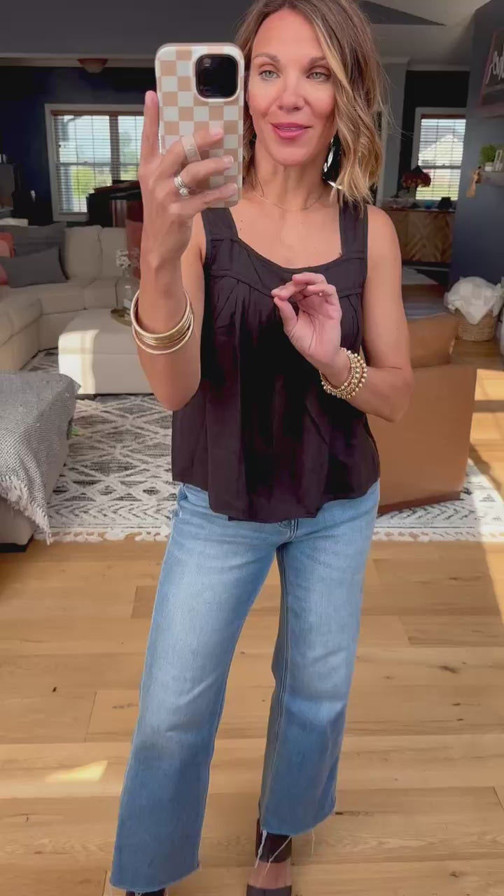 A simple and cute black tank! This has nice wider straps and a square neckline. This tank fits true to size and is a lightly flowy style to pair with denim and sandals or heels!