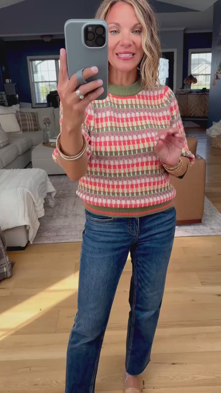 This coral, sage, and mint combo knit brings vintage flair with its square-patterned design and ribbon-like texture. The elastic-banded collar, hem, and sleeves give it a flattering fit while adding playful detail. A timeless piece with a fresh, colorful twist.