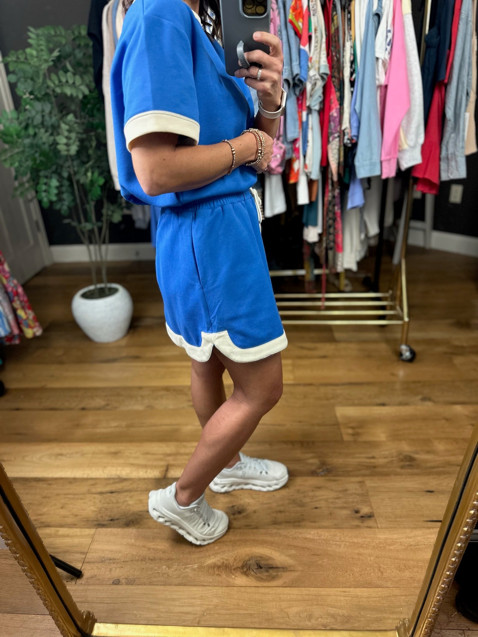 This cute look is sold separately, but also looks adorable together! This skirt is a vibrant blue color with white trim and a drawstring elastic waistband. It has pockets and a true to size fit. This is a true skirt, so no shorts underneath, so keep that in mind! Perfect to dress down with sneakers or dress up with sandals or a wedge!