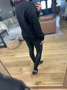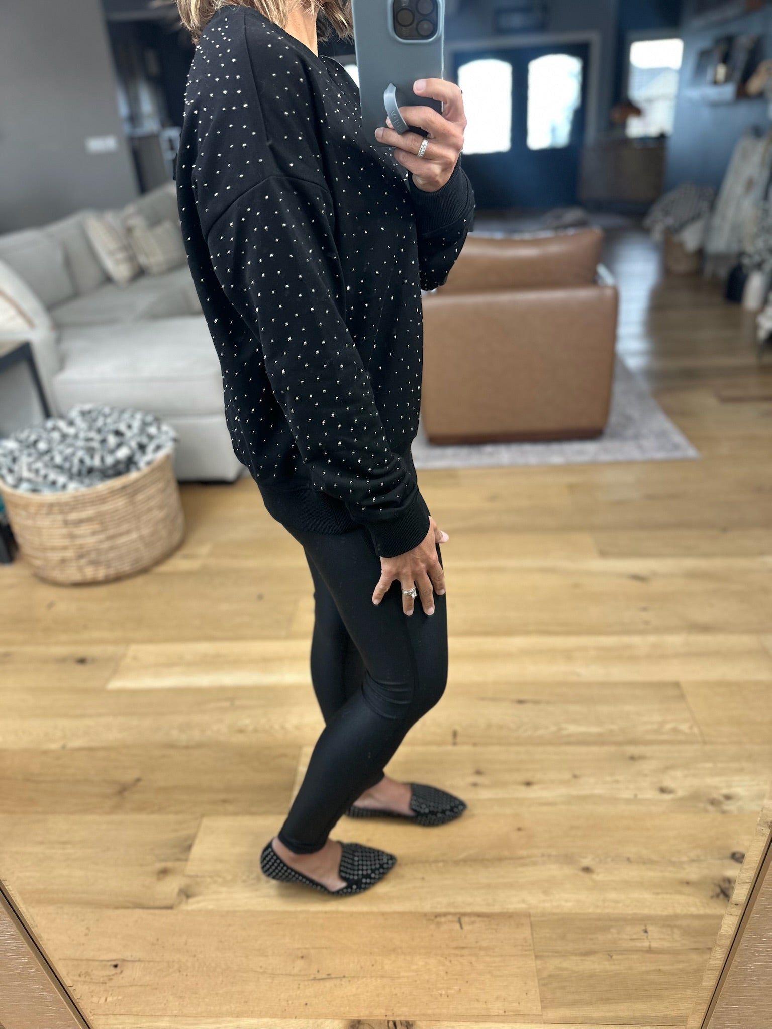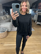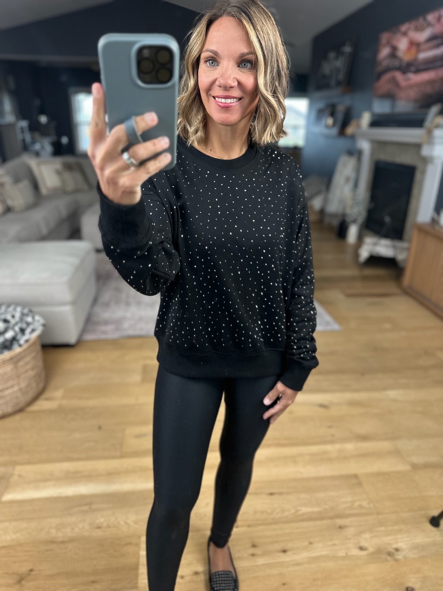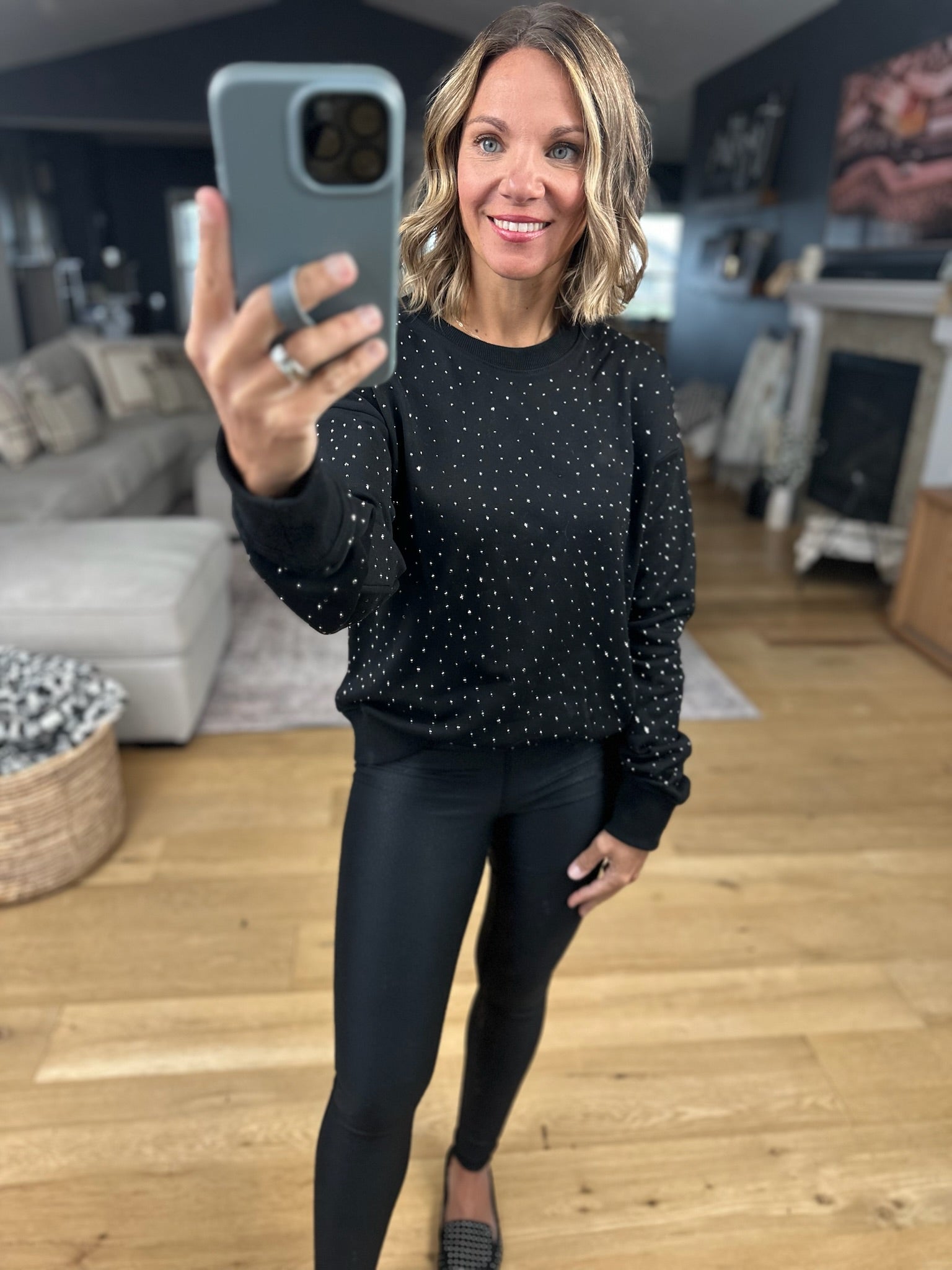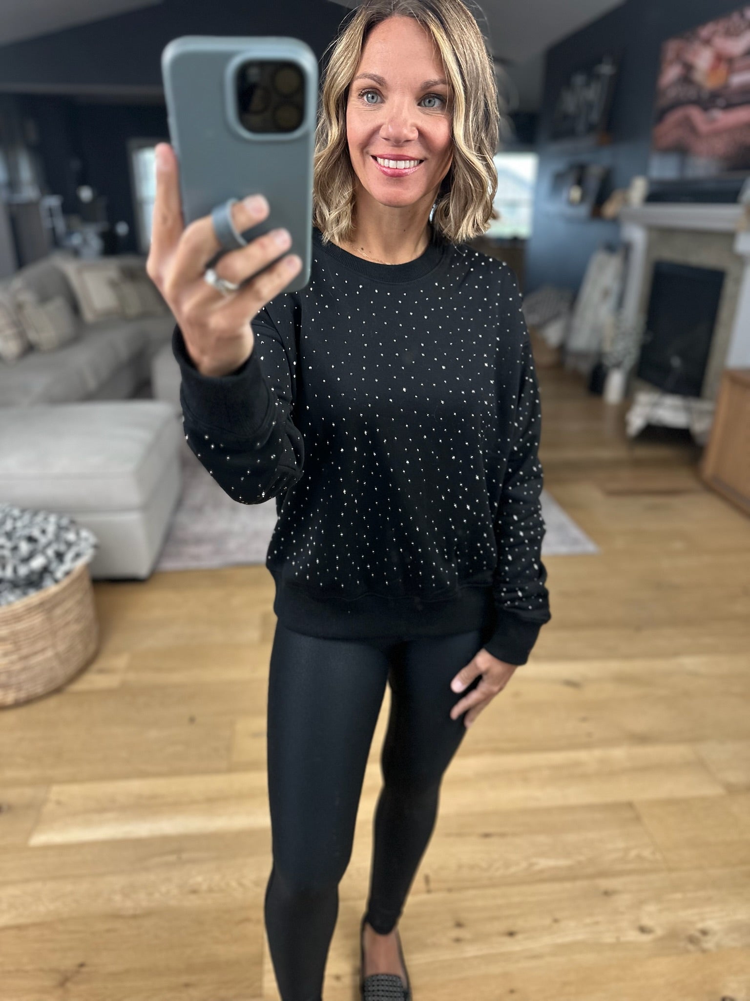 Add some sparkle to your day with the Think of Me Now Jewel-Detail Crew! This is a staple black pullover with a fun addition of small sparkles throughout. It fits true to size and is fun for the holiday season ahead!