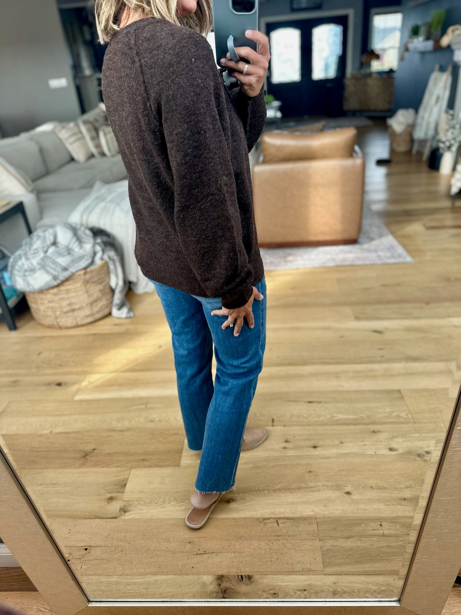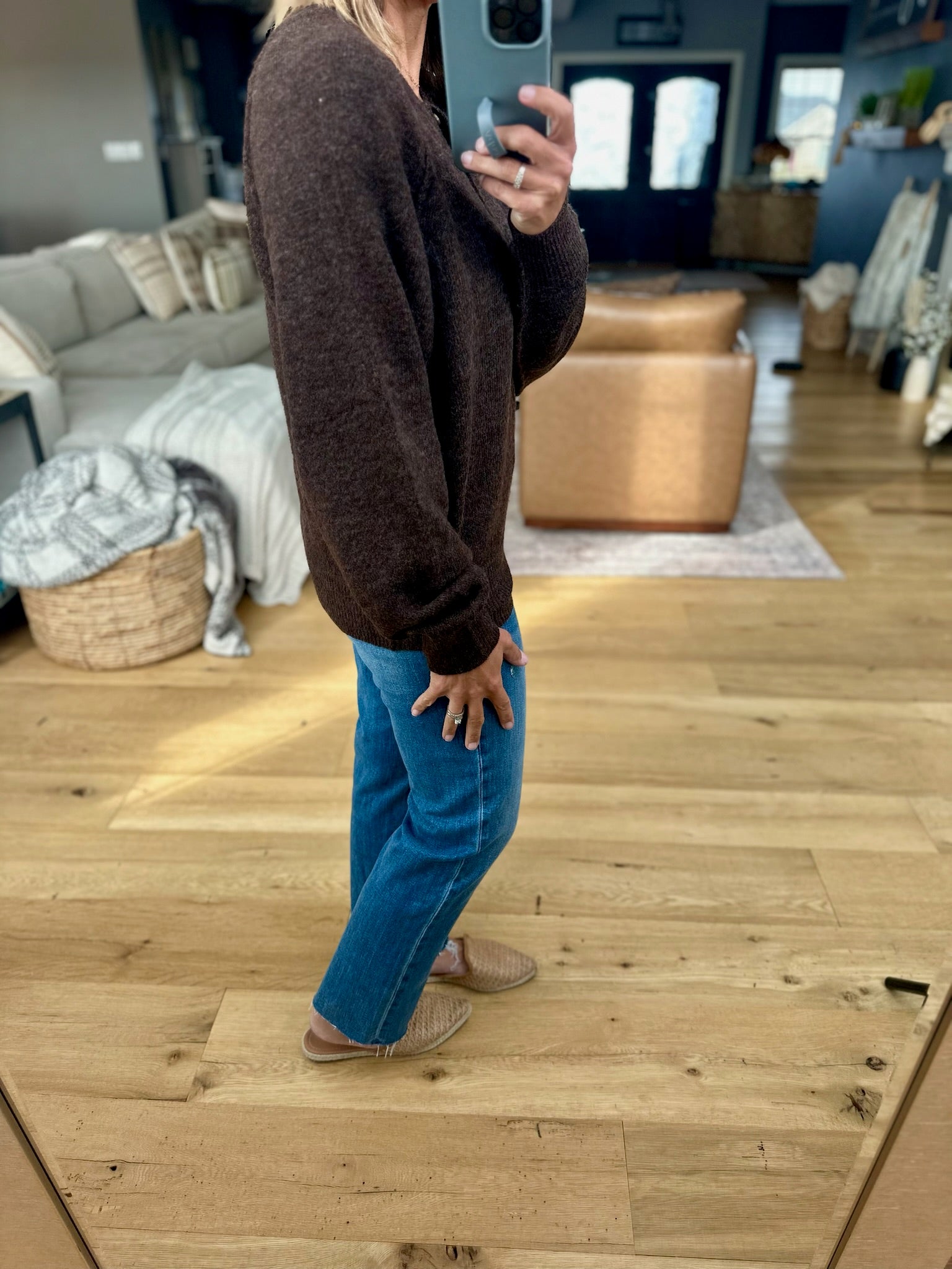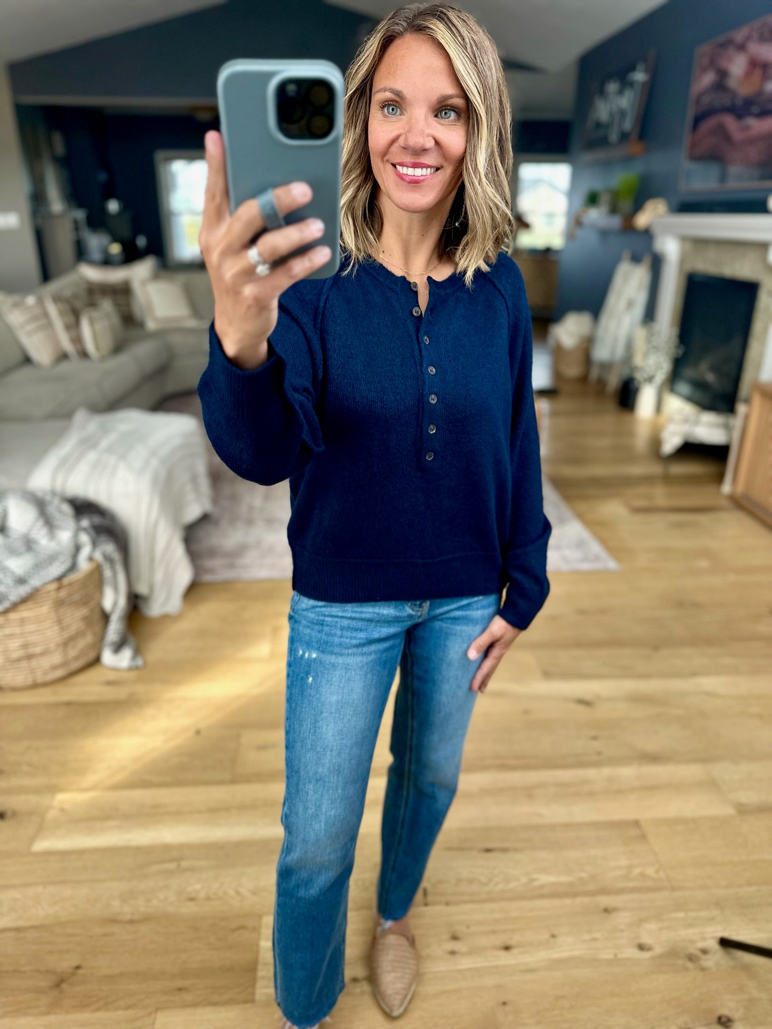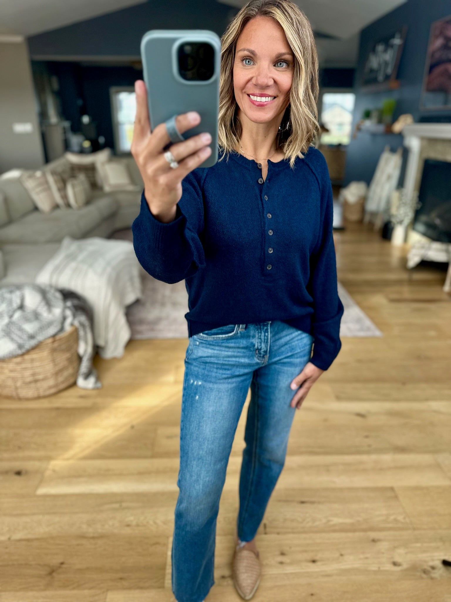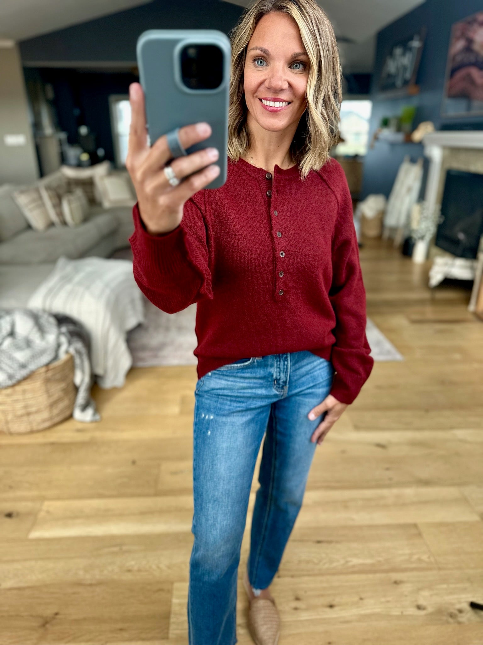 The Yours Truly Button-Detail Knit fits true to size and comes in three color options. Made from cozy material, it features snaps at the neckline and a longer length. Pair it with your favorite denim and mules or boots for a go-to fall look!