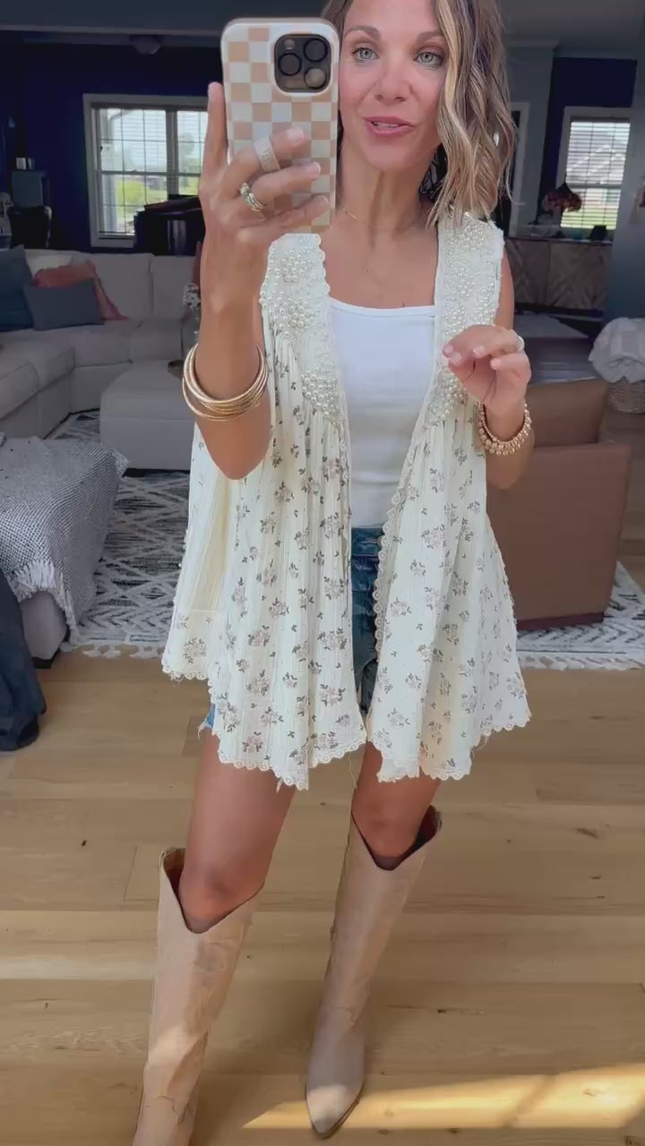 The most adorable boho style floral vest yet! This is a flowy style with lace detailing at the shoulders and a true to size fit. It is perfect to throw over a tank or tee with denim for a darling boho look!