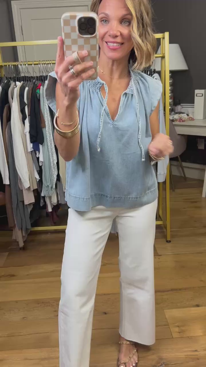 Take a stylish step back with this lightweight denim blouse. Featuring a v-neck and optional tie detail, this top is true to size for a perfect fit. Ideal for a casual yet trendy look, this blouse is sure to be a wardrobe staple!