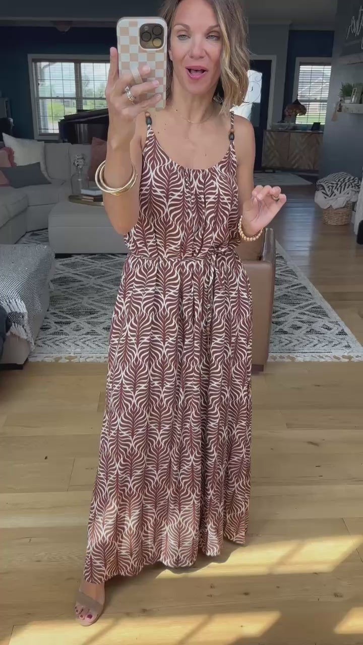 The All About Me Pocket Maxi Dress in neutral brown features a fun print and spaghetti straps. Designed true to size, it offers a flowy silhouette with an elastic waist that adds just the right shape. Plus, handy pockets make it as practical as it is stylish—perfect for summer days!