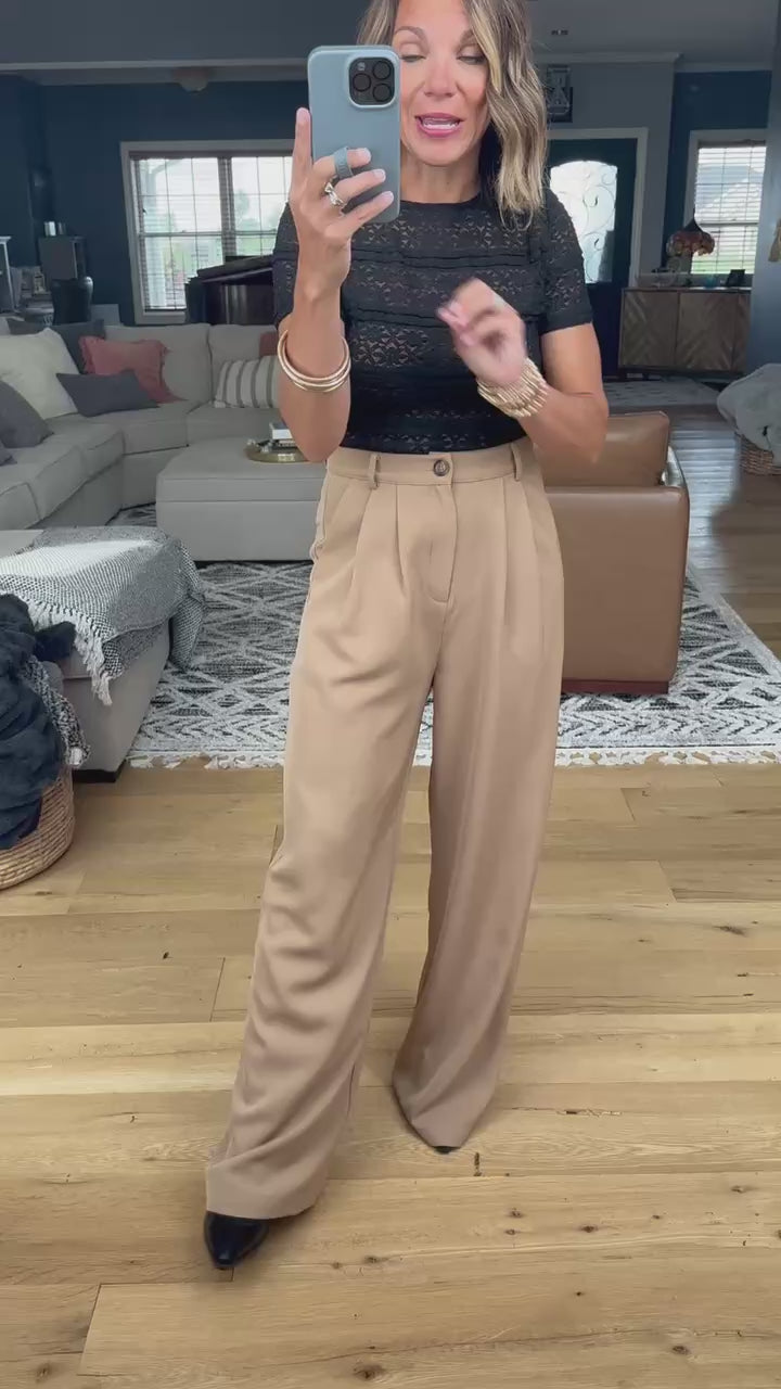 These are a chic and classic style trouser! They are a nice neutral khaki color with a high rise waistband, pockets and wide leg cut. They are a great option for classy days and for work!