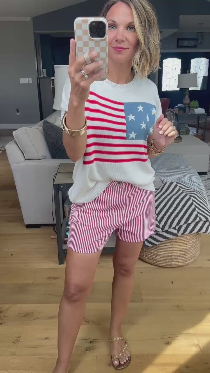 With Memorial Day and 4th of July around the corner, we had to grab this top for the shop! This is a cute knit top in white with a flag across the front. It fits true to size and is a nice length for wearing out or front tucking with shorts!