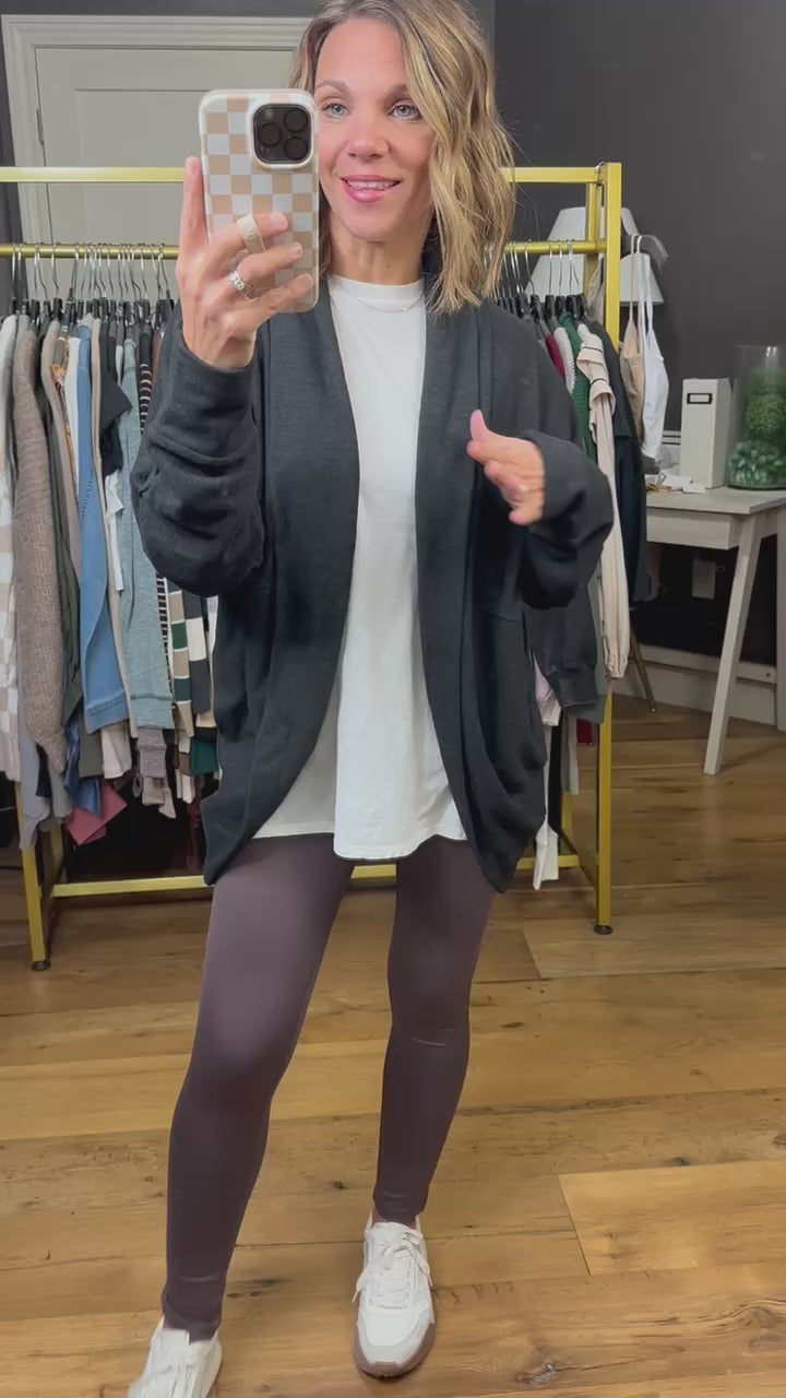 This is the softest, coziest cardigan! This is a charcoal grey sweatshirt-like material with a drapey design and relaxed fit. This cardigan has pockets and is a long enough length to pair with leggings too. This is just the thing you need for an extra layer for running errands, dropping the kids at school and more!