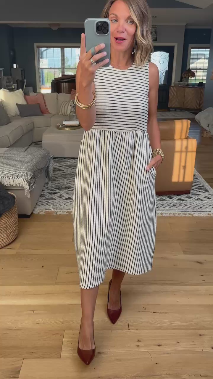 Step out in style with the Brunch By Noon Pocket Midi Dress! Featuring classic black and white stripes, this true-to-size, sleeveless dress is perfect for easy, breezy days. Its crew neck and bra-friendly design make it comfortable and flattering, while the midi length adds a touch of chic. Throw it on and go—your new favorite effortless look awaits!