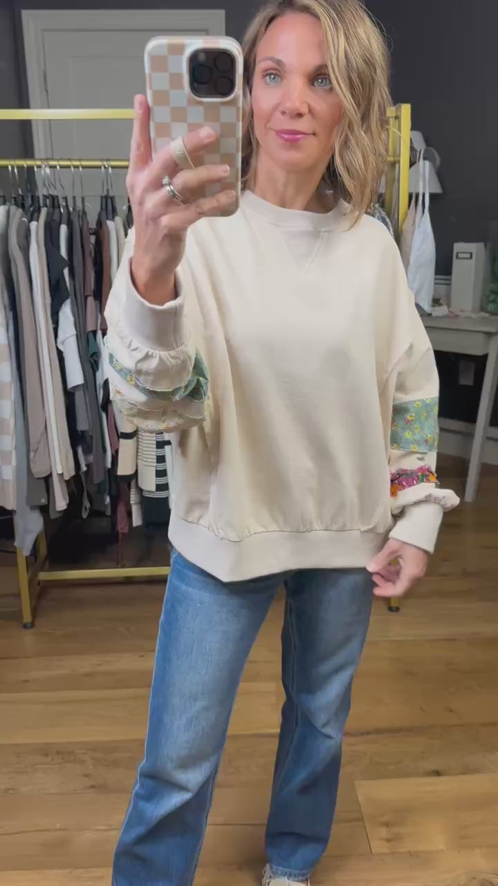 This is an oatmeal crew neck pullover with the prettiest patchwork floral color blocking on the sleeves! This is a relaxed style top with slight balloon sleeves with those fun pops of color in the mixed print. This is a cute and easy option to throw on with denim or leggings!