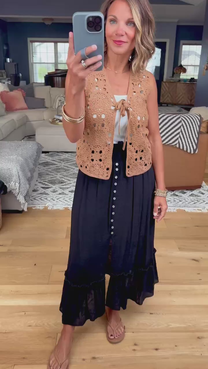 Such a pretty boho style vest for fall! This fits true to size with an open crochet design and tie closure down the front. Throw this on over a tank or tee for a cute textured and layered look!