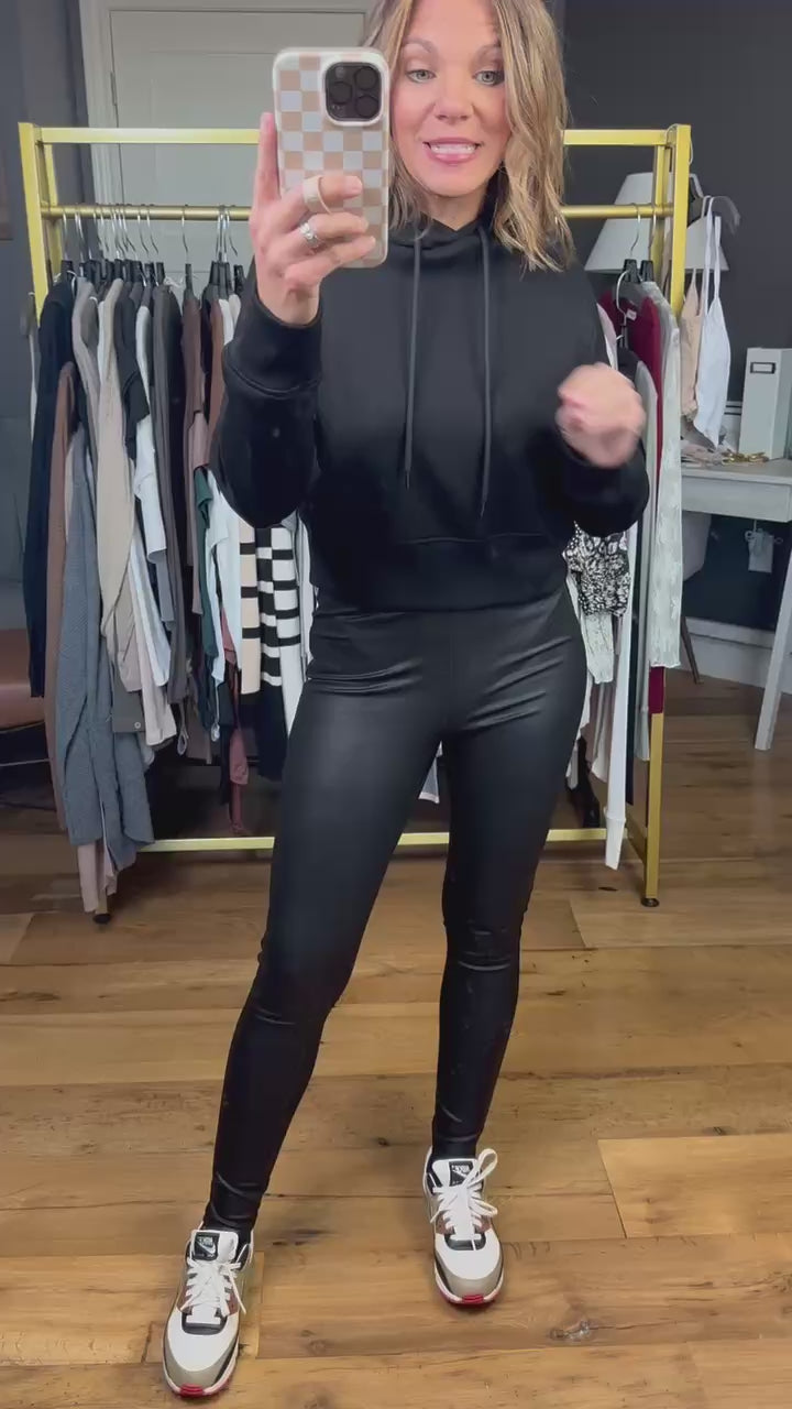 One of our favorite brands came out with this new faux leather leggings so we had to bring them to the boutique! These fit true to size with a high rise waistband and medium compression. Steph is 5'2 wearing a size small and they are a touch long on her, so they can be cuffed up or perfect for taller gals!