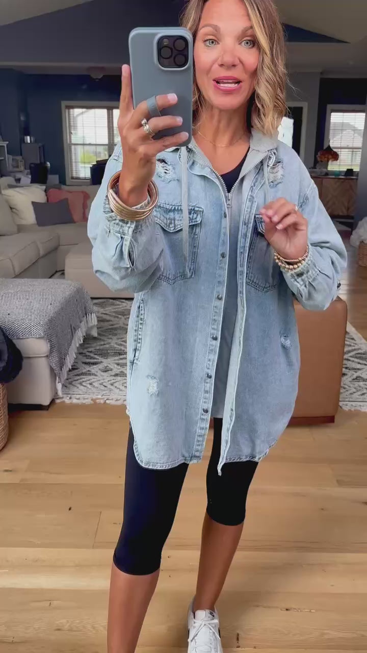 We have been waiting for this one and are so excited it is finally back! This is a super cute style denim jacket and zip up sweatshirt hybrid! It has a relaxed, oversized fit with a hood, pockets and a zipper. Pair this with biker shorts or leggings for a super casual look! If between sizes, you could size down unless you want it quite oversized.