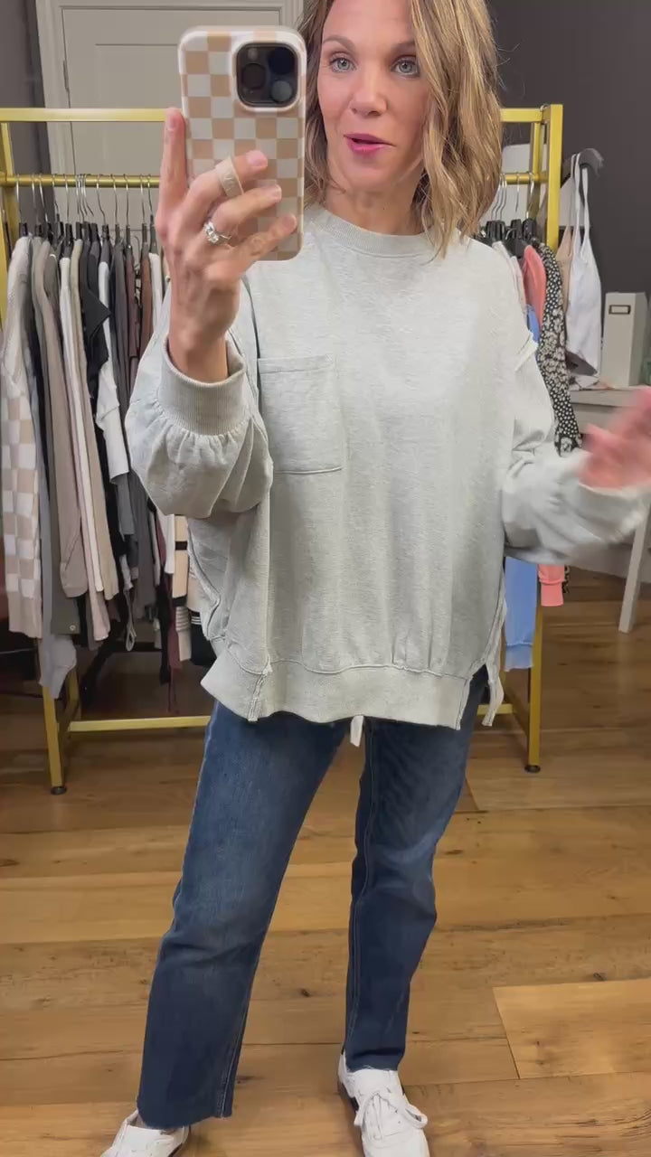 This is a great casual tee in heather grey! This fits true to size and is a relaxed style. It has balloon sleeves with a pocket detail and longer length. Throw this on with denim or leggings for a cute and comfy look!
