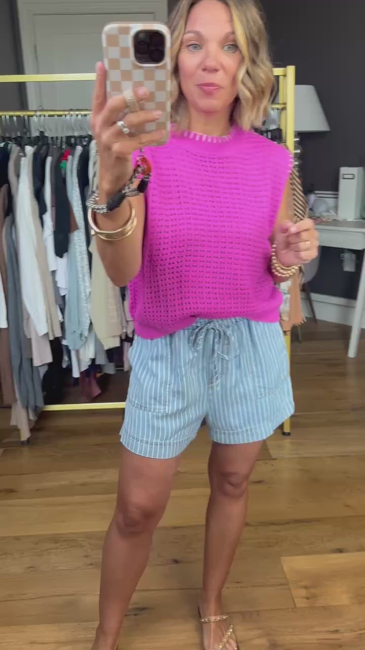 We are obsessed with this eye catching fuchsia sweater tank! This fits true to size with stitch detailing at the neckline. Pair this with trousers or denim this season for a pop of color!