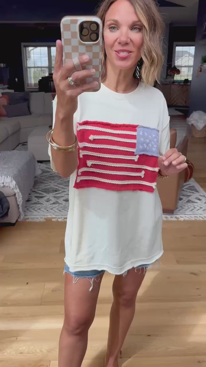 How cute is this tee for the 4th of July! This is a relaxed style tee that is a longer length with raw hems. It has a fun flag on the front and is perfect to pair with denim and sandals for the summer!