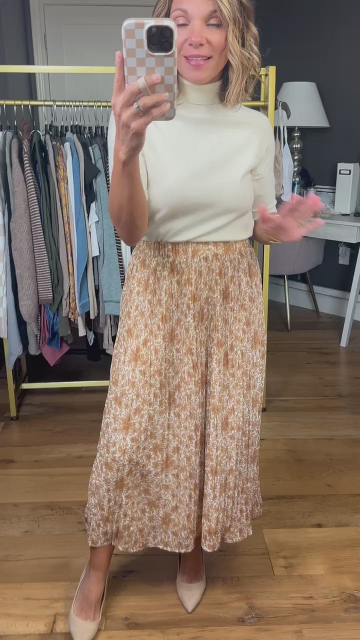 We love a flowy skirt, and this one has the cutest pleat detailing and floral print! This fits true to size with a high rise waistband and maxi length. Steph is 5'2 wearing a size small for reference, and she paired it with our Better News Short Sleeve Turtle-Neck and heels!