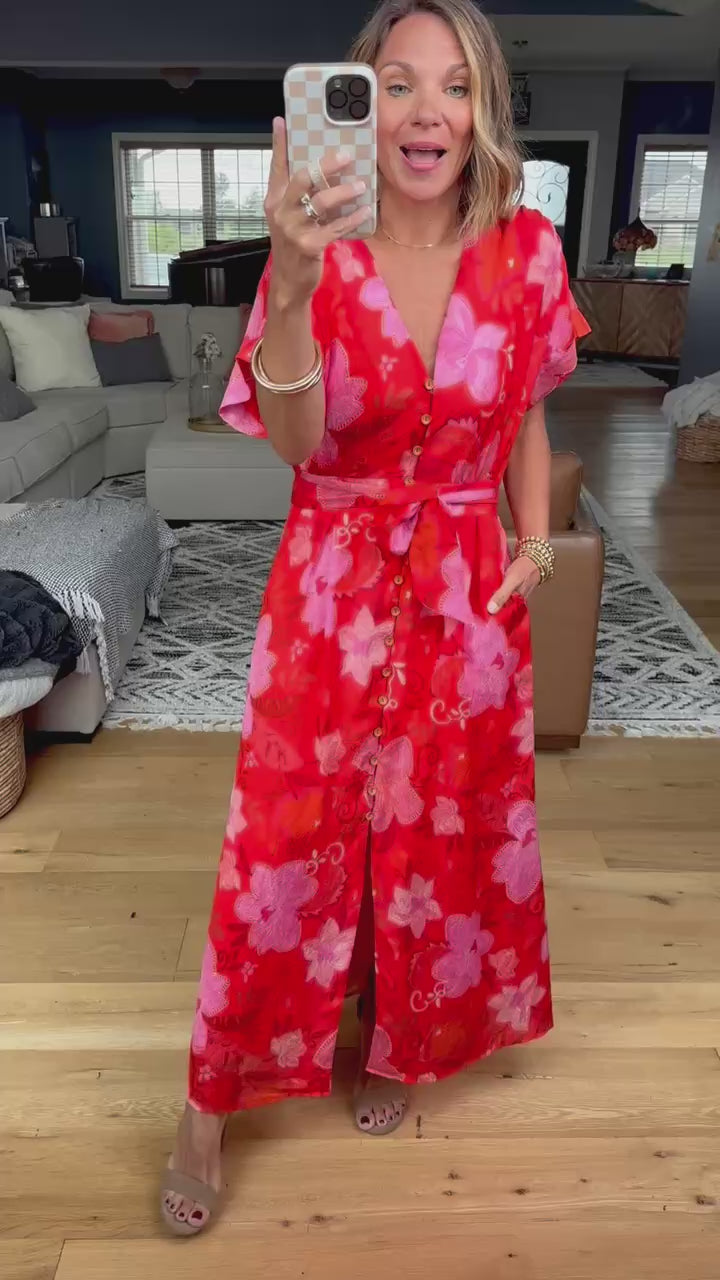 Step into sunshine with this playful floral jumpsuit featuring buttons down the front and a flattering v-neck. The tie at the waist highlights your silhouette, while the wide-leg design adds breezy comfort. True to size and bursting with charm, it’s perfect for turning heads at your next event!