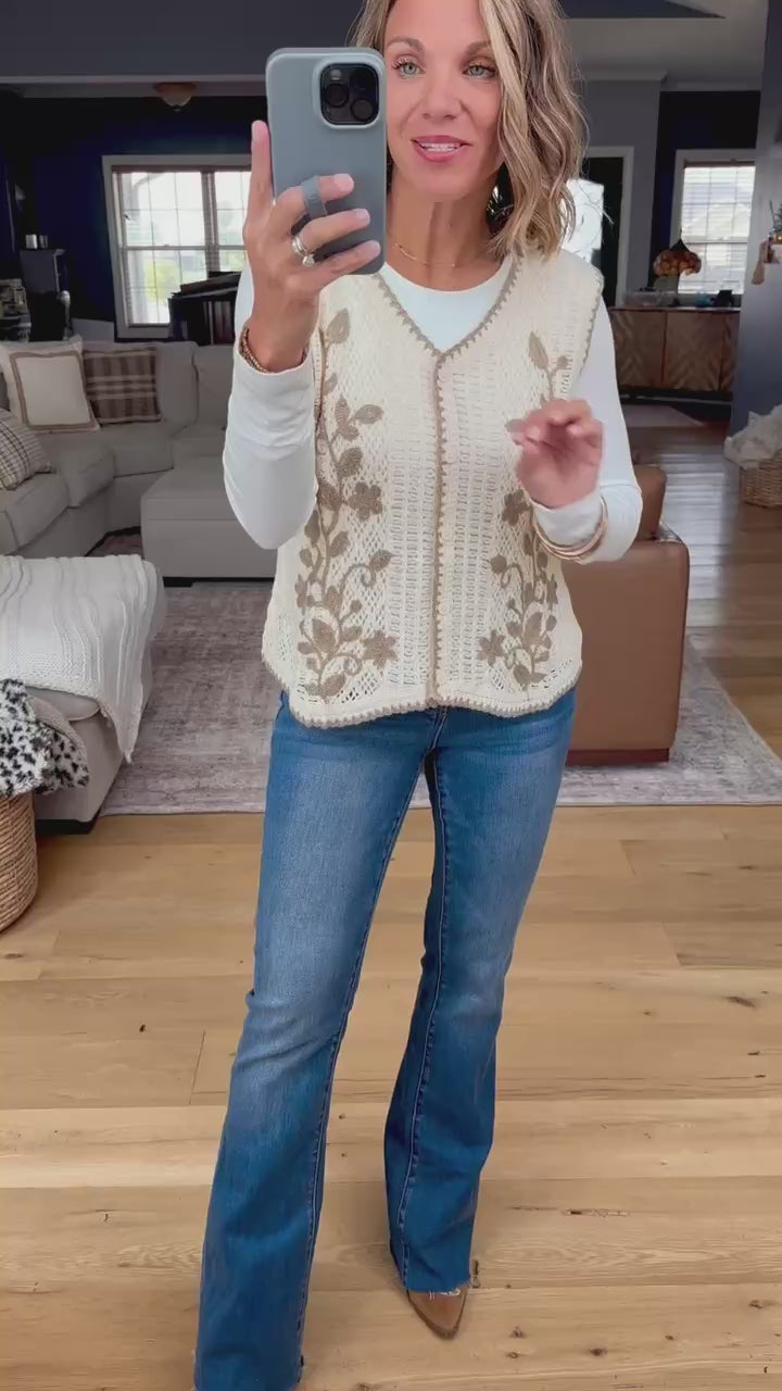 Bring a hint of boho charm to your wardrobe with this natural crochet knit sweater vest. Accented with taupe floral crochet appliqué across the front, it blends artisanal detail with a timeless feel. This fits true to size and is perfect for layering through the seasons!