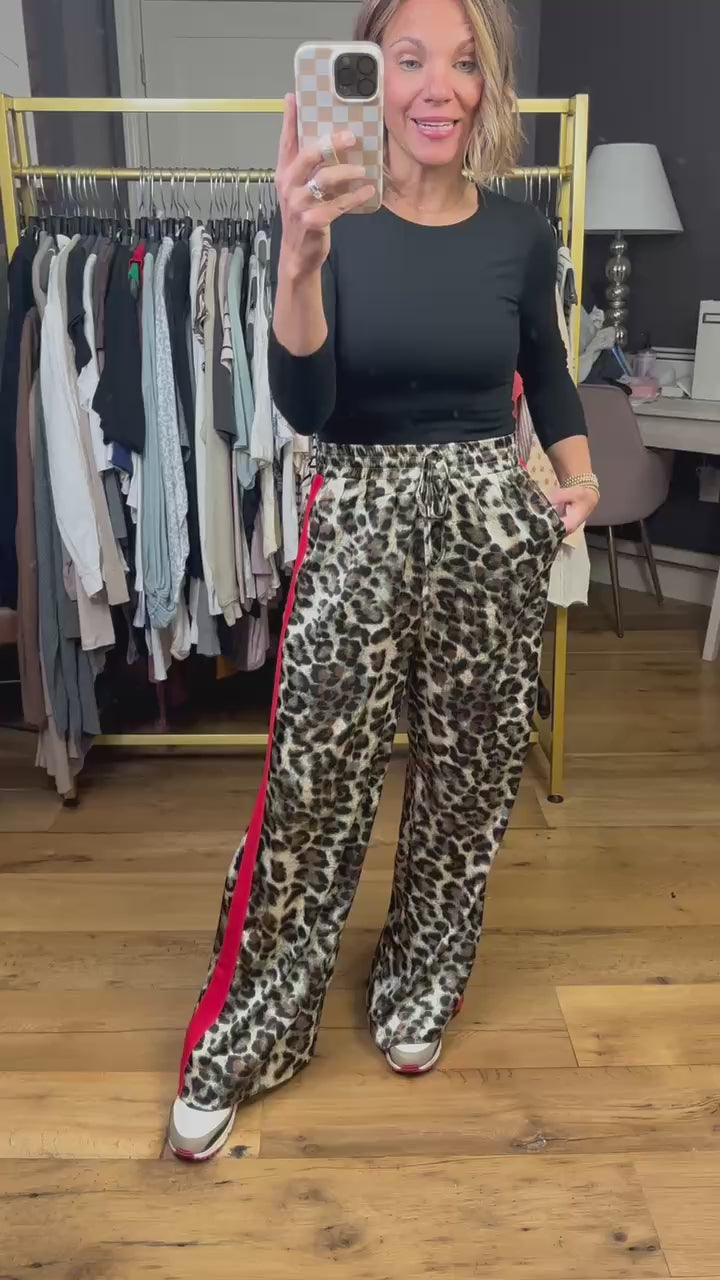 Leopard print has been such a big trend lately so we couldn't resist these pants! They are a fun silky material with a vibrant stripe down the legs. They fit true to size with an elastic waistband. Pair these with a simple tank or tee and sandals or sneakers!
