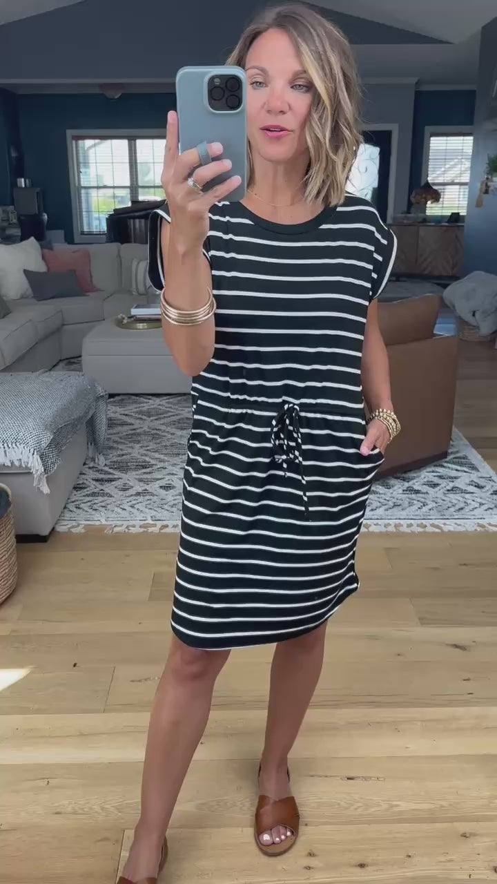 This playful striped dress features a flattering tie at the waist and handy pockets for your essentials. Available in two colors, its true-to-size fit ensures comfort and style all day long. Perfect for adding to any wardrobe!