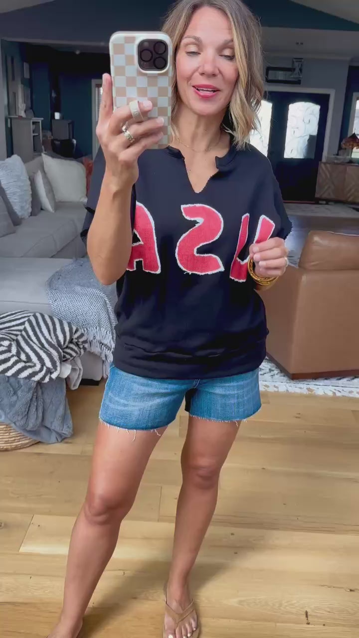 This is a fun graphic style top perfect for the patriotic season! This fits true to size with raw hem detailing and a notched neckline. This says, "USA," across the front and is great for styling with denim shorts and sneakers or sandals!