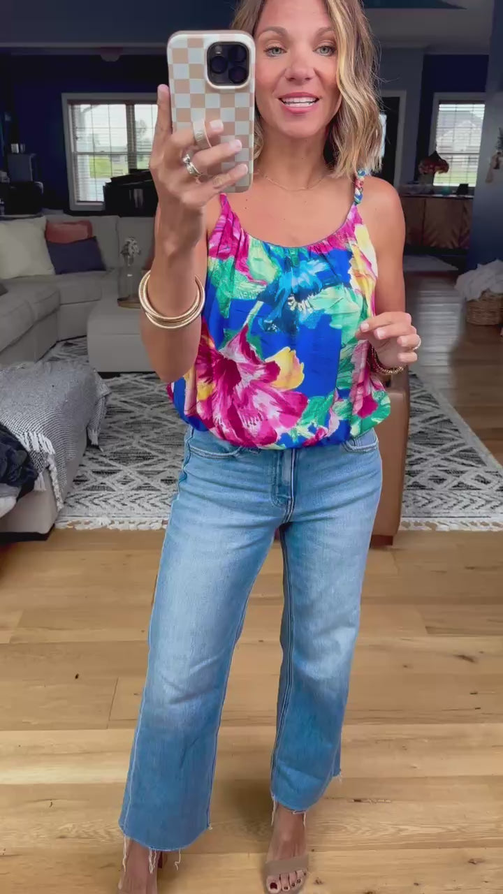 Embrace island vibes with the Islands Far Away Floral Top, featuring playful braided straps and a vibrant tropical floral print. Designed to fit true to size and it has a flowy style.