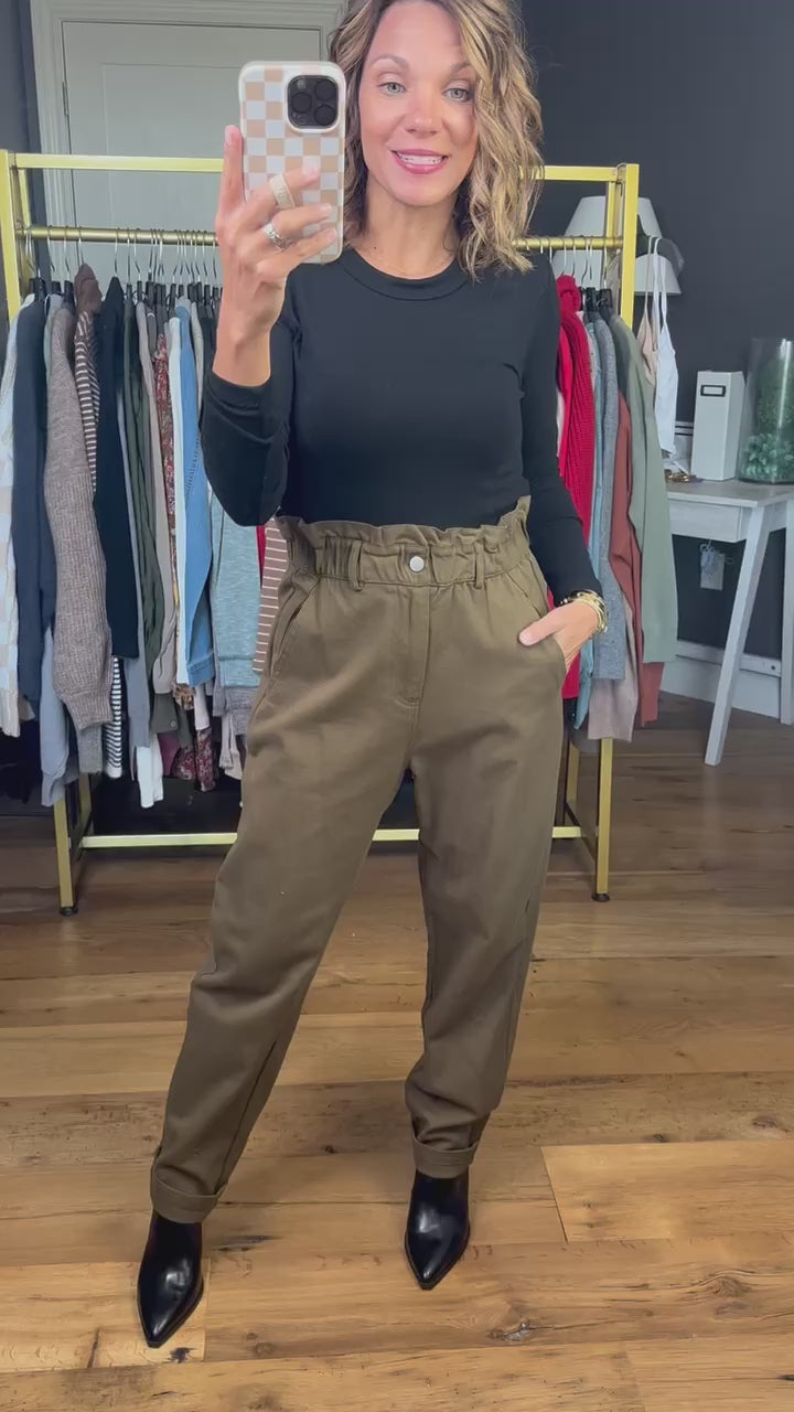 We love the paper bag waist design, and these olive ones are cute as could be! These are a fun and different style for fall! They fit true to size with pockets and a straight leg cut. Throw these on with a long sleeve or bodysuit and booties for a chic fall look!