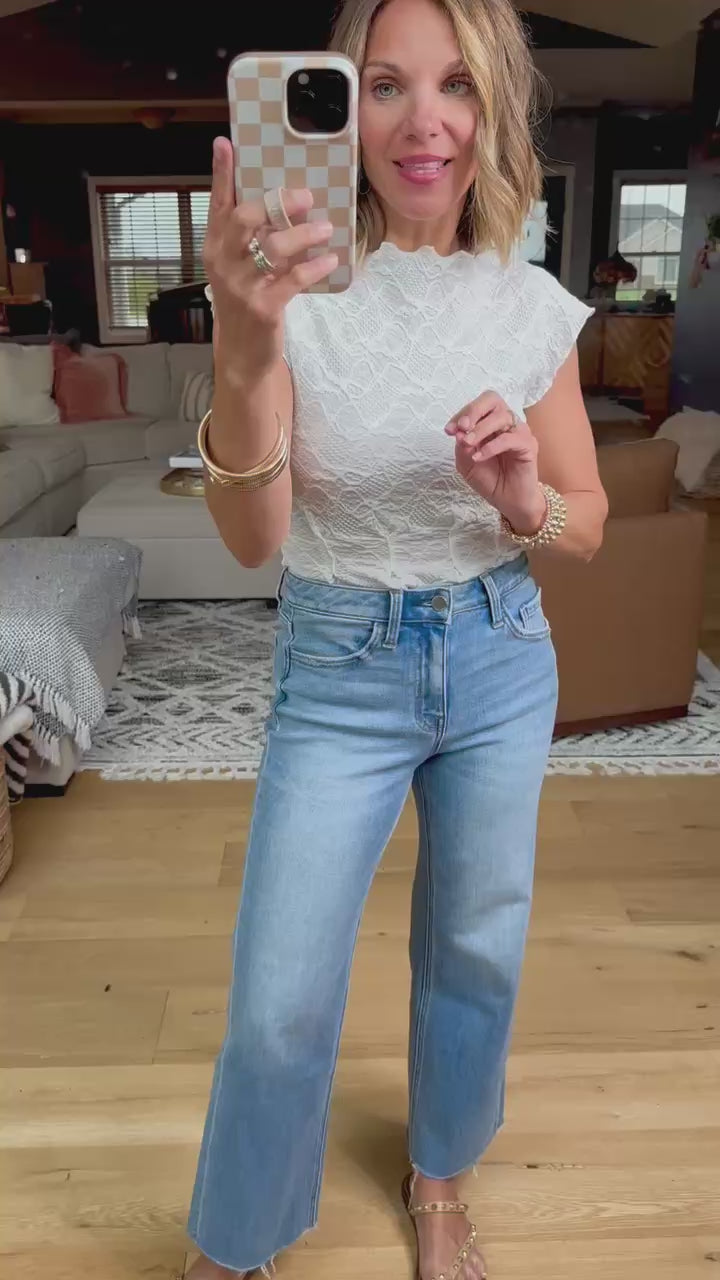 Lace is a big trend lately, with this top fitting right in! This is an ivory colored lace blouse with a fitted style and true to size fit. This has a high neckline and cap sleeves. This is nice for pairing with denim or trousers!