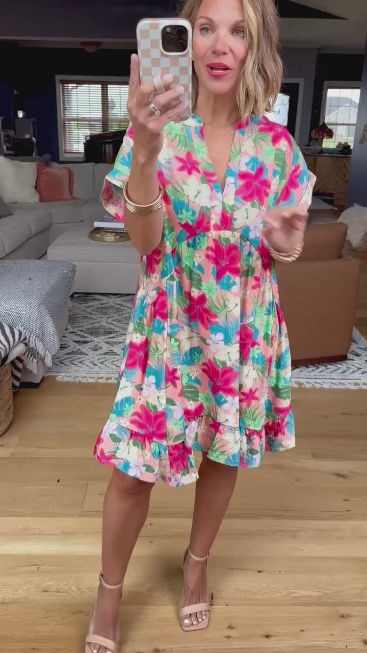 This dress has us ready for vacation or a fun summer event! It fits true to size with a v-neck and flowy style. The floral print is giving us all the tropical vibes and is a perfect option to pair with sandals or heels!