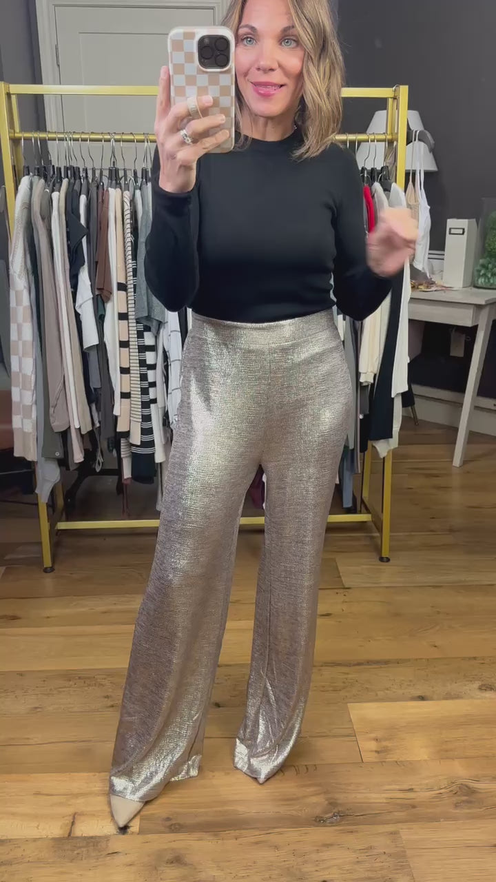We have the perfect glitzy outfit for the holidays! These are a pretty champagne shimmery pant with a high rise waistband and flowy style. They fit true to size and look great with the matching blouse or a simple black top!