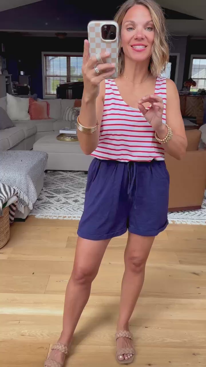 An easy romper for the summer season! This fits a little relaxed, with a scoop neck in the front and back, but with nice thickness of straps for pairing with standard bras. It is an easy one piece romper that is a great grab and go, perfect for easy summer styling all season long!