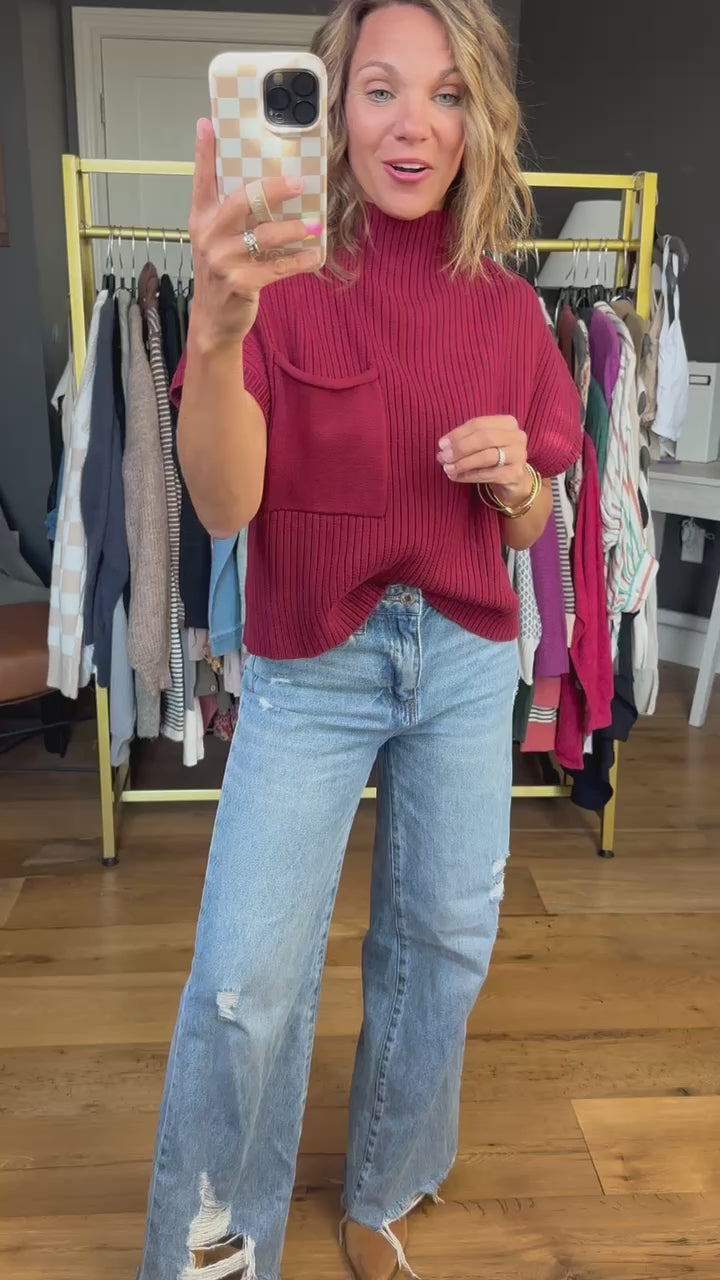 This one may look familiar because it is a popular style we have had before! This is a short sleeve sweater top that is a trendy style! It fits true to size with a mock neck and pocket detail. A somewhat boxy style that can work with dress pants or denim!
