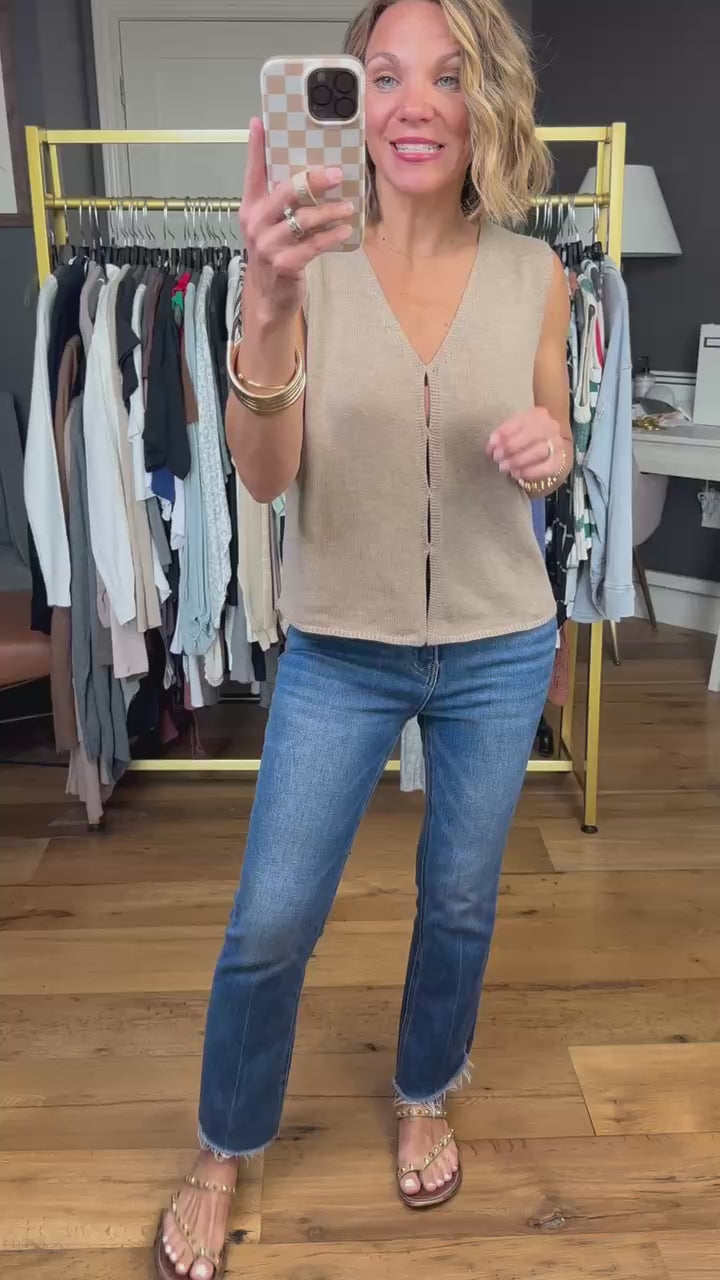 Two colors in this cute knit sweater vest! This fits true to size with a fun open closure down the front. If you want added coverage then we suggest throwing a tank or brami underneath!