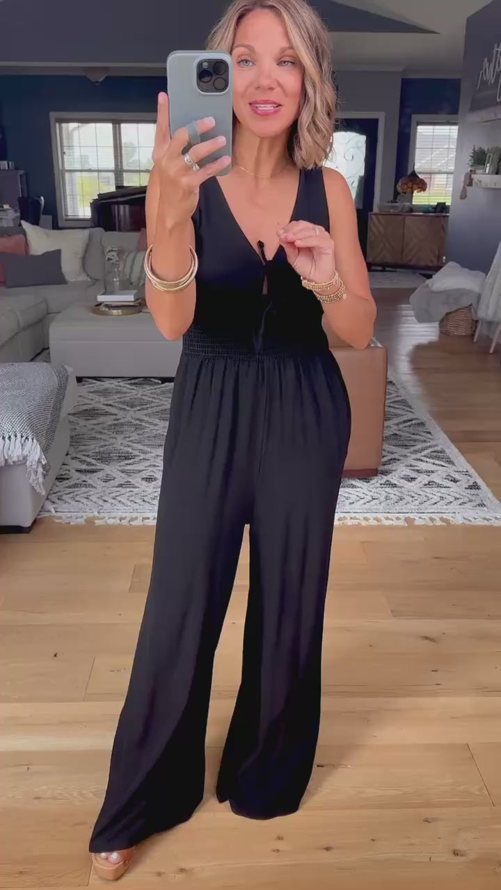 Chic and versatile, this black jumpsuit features a flattering tie-front V-neck, cinched waist, and flowy wide legs. Effortless to style, it’s the perfect one-and-done look for day or night.