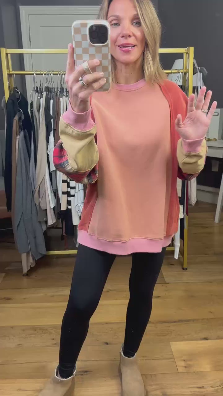 This is calling your name for fall! This is a cute colorblock top with plaid patchwork detailing. It fits true to size, but relaxed, with balloon sleeves and a longer length. Pair with denim or even leggings!