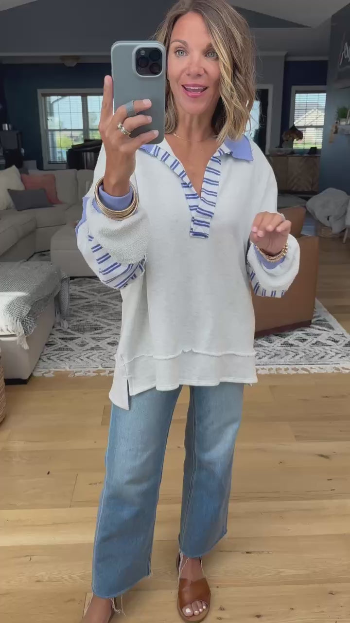 This is a pretty top with a slightly boho vibe! This has a v-neck, collar and stripe detailing. It fits true to size, but relaxed, with a longer length and side slits along the bottom hem. We also love the design of the balloon sleeves!