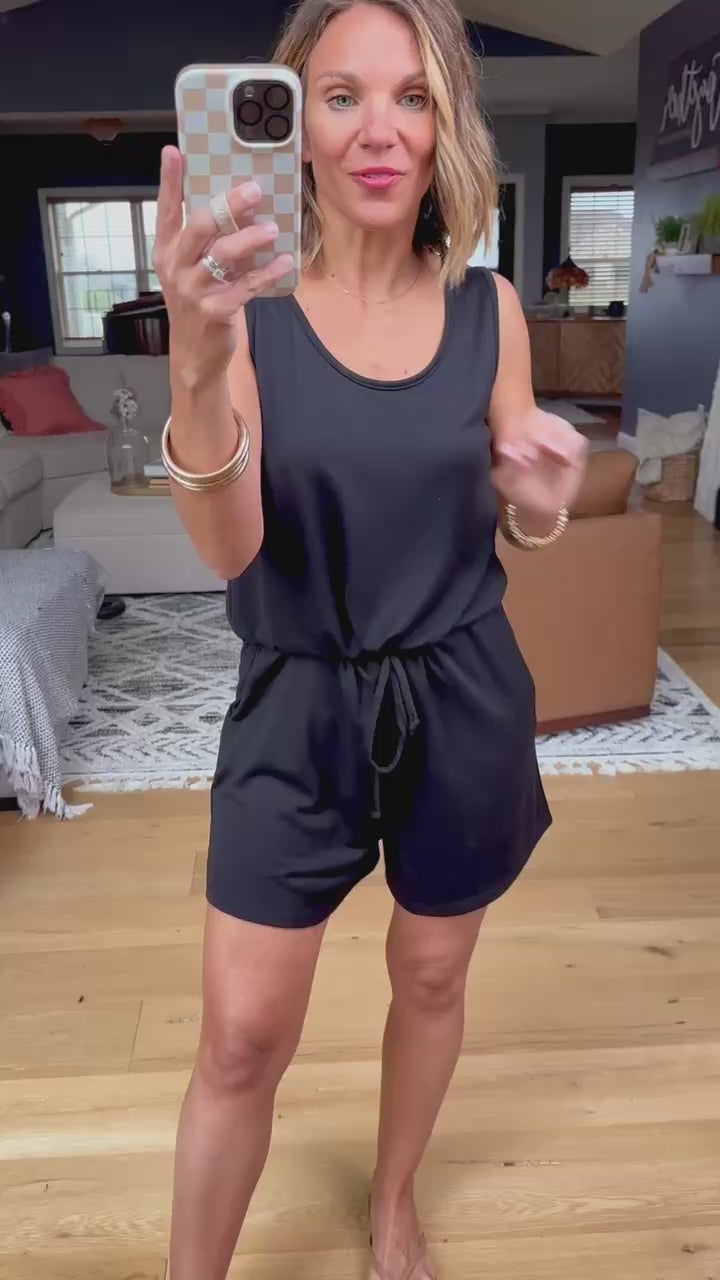 This is the perfect summer outfit! This is a staple black romper with a true to size fit. It has a scoop neck, tank cut, drawstring waist and pockets! Perfect to pair with sandals or sneakers!