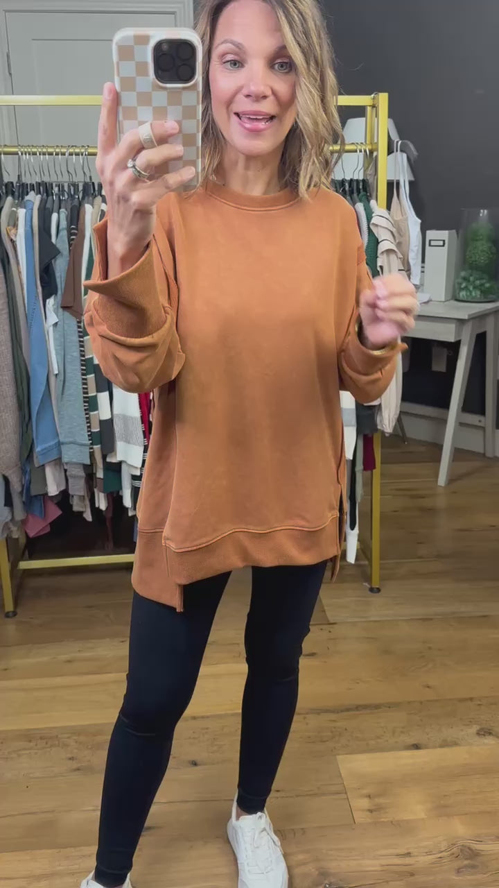 This is a crewneck pullover that comes in a pretty oatmeal color and a fun fall toffee! This fits true to size, but relaxed, with seam detailing and side slits along the bottom hem. Pair this with leggings or denim for an easy and quick fall look!